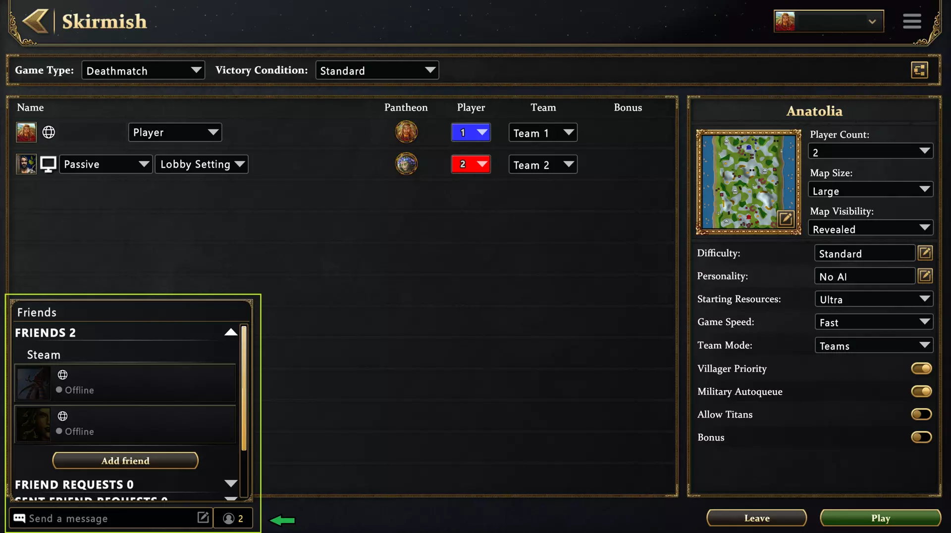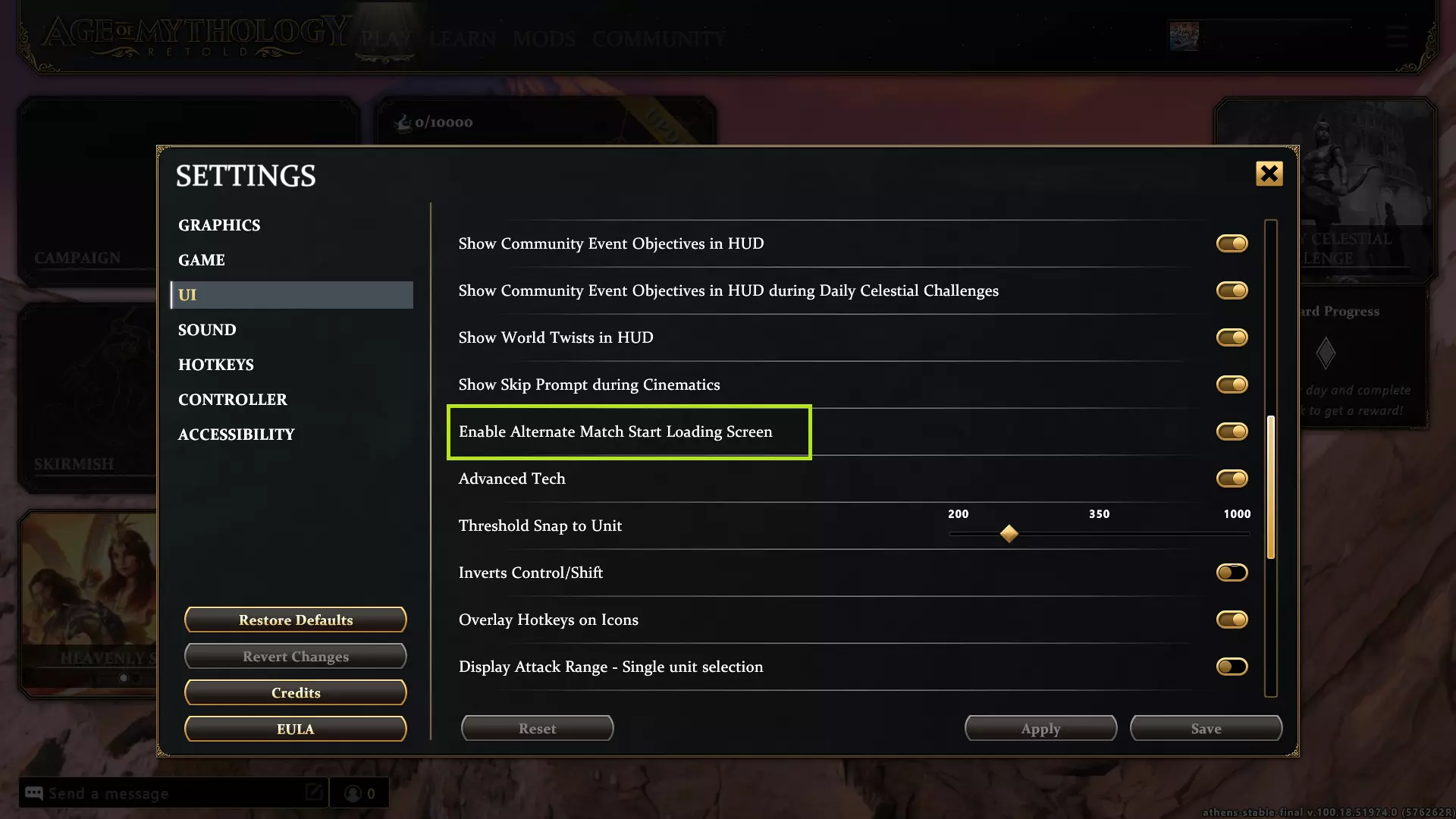 The new “Lower Chance of …” Settings. When you enable these options, they will reduce the frequency of that game mode by swapping out at least 50% of occurrences for Standard mode. The final Boss Node will always be swapped if it would have appeared as a mode you have said you want to see less of. Four New Chaos Events Insect Invasion: A shift of winds has drawn Pestilence into your buildings. When this event occurs, it will trigger a modified version of Pestilence at every Town Center on the map for 25 seconds. Dank Chaos: The Kappa are here for you. Enter their swamps at your peril. When this event occurs, it spawns multiple large areas of swampland with Kappa around the map. Conscription of the Peasants: All players gain one or more additional villagers at each Town Center. This Chaos Event is a respite from Chaos, but don’t let that fool you! All players earn the same economic boost, so make sure to put your conscripted peasants to work quickly! Cluck-Cluck-BOOM! Beware the chickens! They are here for revenge after their kind have been feasted on during the battles between Pantheons. When this Chaos Event activates, you will see many chickens spawn all across the map. The chickens will explode, throwing everything around them after a short time. Carefully step away and don’t look them in the eye! New Favor Stash Items During this update, we have added 5 new Favor Stash items. Exchange Scout Program: (Level: 50 Cost: 100) Summon a random scout unit. Fortified Perimeter: (Level: 55 Cost: 800) Spawns Fortified Sentinels at all your controlled Town Centers. Mythic Rejuvenation: (Level: 60 Cost: 800) For a short time your units are healed and buildings are repaired near each of our Town Centers. Bountiful Trickle: (Level: 65 Cost: 1000) Gain a small quantity of all resource types over time. Glutton for Chaos: (Level: 70 Cost: 1200) Trigger the next Chaos Event. Gauntlet Balance Changes Changes listed here may also apply to Arena of the Gods Story Mode and the Daily Celestial Challenge if the listed items appear in those modes. When using Kastor as a Legend while playing as the Japanese, you can now make use of the free and fast Age Up available to other Pantheons. All Legends now apply benefits from the Arena of the Gods bonuses that were available to Kastor! This includes the following: All Legends now give extra starting bonus resources at the start of Gauntlet matches. All Legends grant the free and fast Age Up. All Legends now apply the bonus +5 population limit. All Legends now spawn some thematic bonus units similar to how Kastor spawns 3 Murmillos. Hoplite units are spawned with Gargarensis, Circe, and Kamos. Axeman units are spawned with Amanra, Theris, and Setna. Berserk units are spawned with Reginleif, King Folstag, and Halogi. Dao Swordsman are spawned with Yan Feifeng, Chi You, and Nuchou. Kamos has gained a small bonus to his damage. Kamos’s hand attack now deals 6x damage bonus against Myth units. The Enemy Incursion Chaos Event has been rebalanced to modify the quantity of units and the chance of different units appearing. Age 2 myth units have twice the chance to appear as other units. Age 2 myth units can now appear in groups of 1 to 3. Age 3 myth units can now spawn in groups of 1 to 2. Age 4 myth units will now always spawn as single units. Titans can now appear as a Titan from any Pantheon instead of only the Greek Titan. Titans still only spawn during the Enemy Incursion on Legendary difficulty. Caladria can no longer spawn as one of the possible options. Chaos Events will now never repeat the same event twice in a row. Reduced the damage done by the Fault Line Chaos Event. This weaker version of Earthquake’s damage has been reduced from 10 → 9 damage per hit. Reduced the damage done by the Rage of Zeus Chaos Event. This weaker version of Lightning Storm has been reduced from 20 → 16 damage per hit. The Children of Nidhogg Chaos Event will now not occur when there are only 2 players. This reduces the risk of spawning too close to a single player. The children were a little too hostile and could aggro onto a player, wiping them out early in a game. Child of Nidhogg units have had their LOS reduced from 40 to 20 to make them less likely to rush distant enemies. Reduced the chance that Gauntlet matches may end with no interaction, mainly through the above modifications to Chaos Events. When a Player Blessing Event occurs, you are twice as likely to gain a Blessing instead of resources (66% chance). When you do gain resources instead of a Blessing from a Player Blessing Event, the resources awarded are twice as likely (66% chance) to be two different resources. Make Your Stand Together – Co-Op Updates While playing through Gauntlet as the person invited to join a Host, you will gain XP and Favor Stash currency. The gains to XP unlock new Favor Stash items and increase your Favor Stash spend and save limits. You can now use the Favor Stash while playing in the Co-Op mode. When you are invited to participate in another player’s Labyrinth, you will now gain access to all the non-Eternal Blessings that are available to the Host player. This means playing through a Gauntlet will provide more shared progression as the Host chooses which nodes to complete with a Co-op partner. On the Victory screen as the non-Host player in a Gauntlet match, you will now see the reward unlocked by the Host. The non-Eternal rewards unlocked as part of a Labyrinth can be used during subsequent Nodes played with the same Host for the duration of that same Labyrinth. Joining as a co-op player as part of another player’s game will no longer reset your equipped Blessing choices in your own Labyrinth. Other Gauntlet Changes and Fixes Enemy Blessing events now appear in chat as a message from an enemy player to easily see which events are blessings gained by the enemy. Child of Nidhogg now appears as a unique name on the Children of Nidhogg Chaos Event units. Attack Move can now