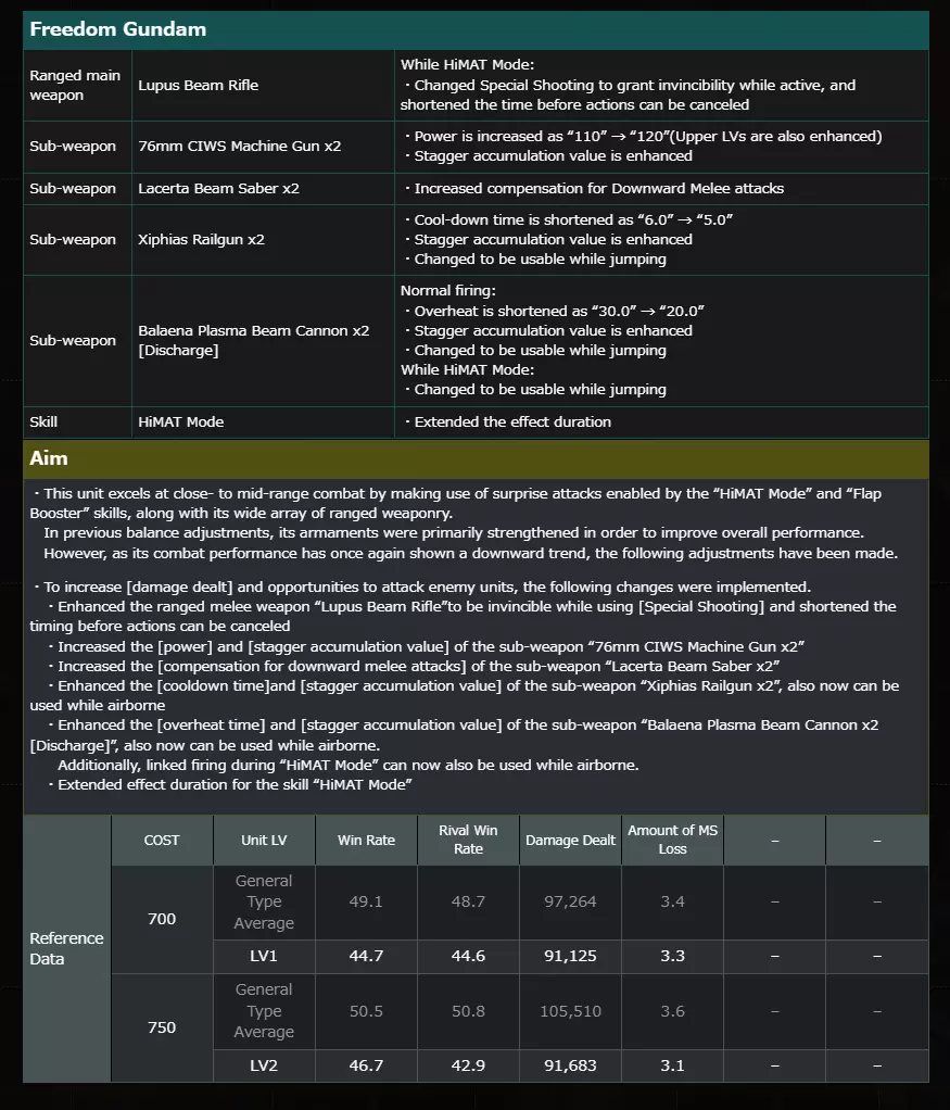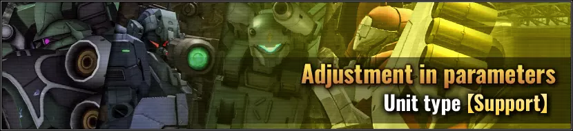 Spec ・Unit HP is enhanced as “22000” → “23000”(Upper LVs are also enhanced) ・Close range part slot is increased as “21” → “22”(Upper LVs are also enhanced) ・Mid-range part slot is increased as “18” → “19”(Upper LVs are also enhanced) ・Long range part slot is increased as “10” → “11”(Upper LVs are also enhanced) ・Unit Skill “Emergency Evasion System LV1” has been given ・Unit Skill “Frontline Support System LV1” has been given ⇒LV3 and above unit skill “Frontline Support System LV2” has been given Sub-weapon: Hand Grenade ・Adjusted to able to use during high speed movement Sub-weapon: Shield Twin Missile Launcher x2 ・Power is increased as “700” → “800”(Upper LVs are also enhanced) Sub-weapon: Waist-Mounted Grenade ・New added 【Kshatriya Repaired】 Spec ・Unit HP is enhanced as “28000” → “31000” ・Unit skill “High-Performance Balancer LV1” is now changed to “Melee Composite System LV1” ・Unit skill “Special Back Add-On Buffer LV4” is adjusted to “LV5” ・Unit skill “Flight Control Program LV3” is adjusted to “LV4” Sub-weapon: Chest Machine Cannon x2 ・Stagger accumulation value is enhanced Sub-weapon: Chest Mega Particle Cannon x2 Normal firing: ・Stagger accumulation value is enhanced Focus firing: ・Adjusted to able to use while moving ・Adjusted to able to use while jumping Sub-weapon: Modified Funnel ・Power is increased as “350” → “380” ・Reload is shortened as “13.0” → “10.0” Sub-weapon: 3-Barrel Sturm Faust ・Power is increased as “2100” → “2200” ・Reload is shortened as “15.0” → “12.0” Skill: Psycho-Frame Light ・Increased the allied unit HP recovery effect upon skill activation from “10%” to “15%” 【Zeta Gundam 3A Type】 Spec ・Unit HP is enhanced as “21000” → “22000”(Upper LVs are also enhanced) ・Unit Skill “De-Transformation Optimizer LV1” has been given Ranged main weapon: ZG 3A Type B Rifle ・LV2 Power is increased as “2250” → “2400” Sub-weapon: ZG 3A Type Arm GL ・Power is increased as “500” → “800”(Upper LVs are also enhanced) ・Reload is shortened as “10.0” → “8.0” ・Stagger accumulation value is enhanced Sub-weapon: ZG 3A Type Head Vulcan Gun ・Range is enhanced as “175m” → “200m” Sub-weapon: ZG 3A Type HML ・Cool-down time is shortened as “6.0” → “4.0” ・Overheat is shortened as “25.0” → “15.0” ・Weapon switching time is shortened Normal firing: ・Power is increased as “3000” → “3500”(Upper LVs are also enhanced) Focus firing: ・Increased power Sub-weapon: ZG 3A Type LB Saber ・Increased compensation for Downward Melee attacks Sub-weapon: ZG 3A Type Shield ・Shield HP is enhanced as “4000” → “6000”(Upper LVs are also enhanced) 【Zeta Gundam 3A Type (Transformed)】 Spec ・Unit HP is enhanced as “21000” → “22000”(Upper LVs are also enhanced) Sub-weapon: ZG 3A Type B Gun x2 ・Power is increased as “300” → “350”(Upper LVs are also enhanced) ・Stagger accumulation value is enhanced Sub-weapon: ZG 3A Type HML (Transform) ・Power is increased as “3500” → “4000”(Upper LVs are also enhanced) ・Overheat is shortened as “30.0” → “20.0” ・Focus is shortened as “1.5”→”1.0″ 【Gundam GP03 Stamen】 Spec ・Unit HP is enhanced as “16000” → “18000”(Upper LVs are also enhanced) ・Close range part slot is increased as “19” → “20”(Upper LVs are also enhanced) ・Mid-range part slot is increased as “14” → “15”(Upper LVs are also enhanced) ・Long range part slot is increased as “7” → “8”(Upper LVs are also enhanced) ・Unit Skill “Tactical Boost LV1” has been given ・Unit Skill “Leg Shock Absorber LV4” has been given ・Unit Skill “Glide Structure LV4” has been given ・Unit Skill “Bullet Feeder LV1” has been given ・LV3 Unit skill “Special Back Buffer LV3” is adjusted to “LV4” ⇒LV4 Unit skill “Special Back Buffer LV3” is adjusted to “LV5” Ranged main weapon: Folding Bazooka ・Power is increased as “1800” → “2100”(Upper LVs are also enhanced) ・Cool-down time is shortened as “6.0” → “5.0” ・Weapon switching time is shortened Melee main weapon: Beam Saber [Enhanced Type II] ・Increased compensation for Downward Melee attacks Sub-weapon: Stamen Beam Rifle ・Power is increased as “1500” → “1700”(Upper LVs are also enhanced) ・Ammo Amount is increased as “5” → “7” ・Cool-down time is shortened as “1.0” → “0.8” ■Raid type