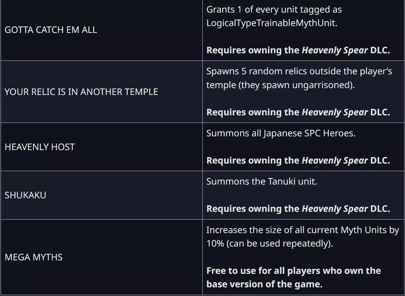 【反击者人格行为】 - 不会占领已知靠近敌人的定居点。 - 当没有可见敌人时不会主动侦察。 - 默认侦察时使用3个单位而非1个,每个单位各有路径。 - 只攻击曾攻击过反击者的玩家,对陆地和海军攻击分开追踪。 - 每个可能被反击的玩家都会收到独特的聊天消息,提示他们现在成为有效目标。 【新增作弊码】 作为【天矛】DLC新增内容的一部分,已添加9个新作弊码。其中一个所有玩家均可使用!“MEGA MYTHS”作弊码将过去补丁中出现的一个漏洞作为功能回归,该功能会使神话单位全部变大。应广大玩家要求,该功能现已作为作弊码回归,你可以用它来放大神话单位以达到戏剧效果。 目前可用的作弊码如下: