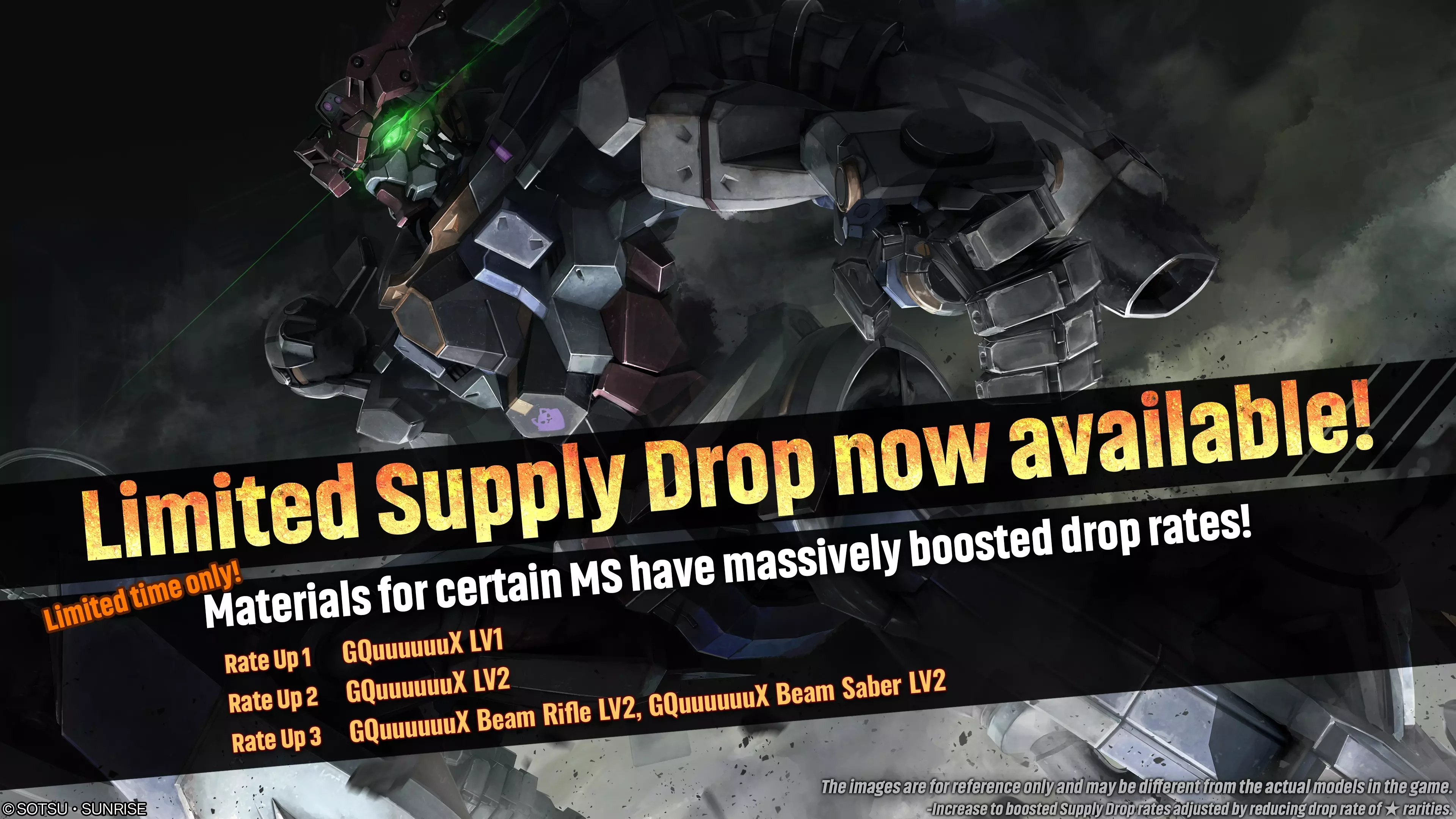 ■活动时间 [太平洋标准时间] 2026年1月8日 00:00 – 2026年1月14日 20:30 [已计划] [中欧时间] 2026年1月8日 09:00 – 2026年1月15日 05:30 [已计划] ■活动内容 活动期间,可在物资柜台请求【限定补给箱(单次/十连)】。 限定补给箱中,GQuuuuuuX的掉落率将提升。 ■补给掉落率大幅提升的重点物资 限定补给箱中,各单位等级和武器的掉落率将分别受到影响。◎补给掉落率提升①(物品数量1) ・★★★ GQuuuuuuX LV1(通用单位,地面/太空可用,成本:500) ◎补给掉落率提升②(物品数量1) ・★★★ GQuuuuuuX LV2(通用单位,地面/太空可用,成本:550) ◎补给掉落率提升③(物品数量2) ・★★ GQuuuuuuX 光束步枪 LV2 ・★ GQuuuuuuX 光束军刀 LV2 ■受掉落率提升影响的补给 ・限时补给 ※本次限时补给可获得的材料与当前普通补给的材料阵容相同。与标准补给不同的是,限时补给中只有指定物品会获得掉落率提升。※限时补给箱的掉率提升对各等级单位及单位主武器的影响不同。 1-2级单位和武器的掉率提升如下: ・1级单位掉率提升3% ・2级单位掉率提升3% ・主武器掉率提升3% 补给箱掉率提升是通过降低【★】稀有度物品的掉率实现的。 ※关于限时补给箱的详细物品列表,请查看【物品清单】。 ※请求限时补给箱所需的代币数量与普通补给箱相同。(1次 – 3代币 / 10次 – 30代币) ※请务必查看活动日程,以免错过任何内容。 ■回收计数器新增可兑换材料 ⇒ 新增材料相关信息 ■机体 ・新增★★★ 梅塞尔F01型 LV1–2 ・新增★★★ 高机动型京宝梵 LV1–2