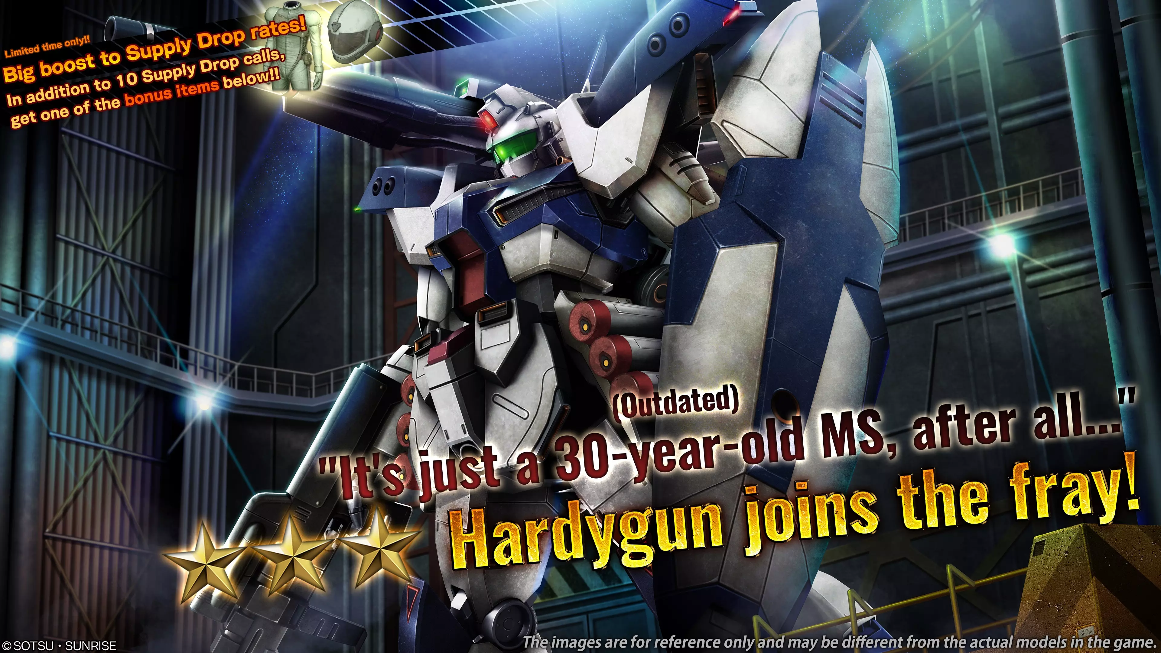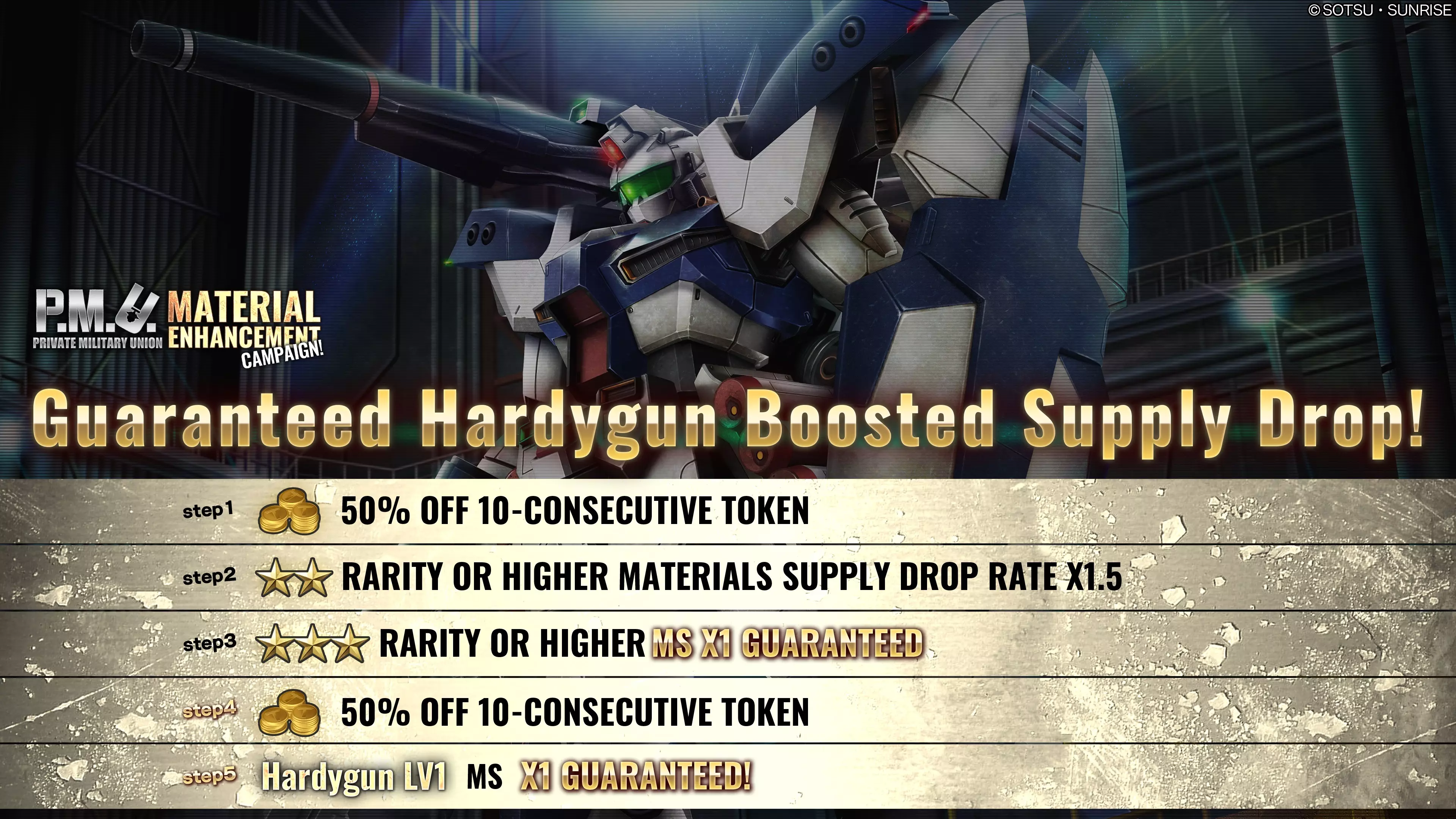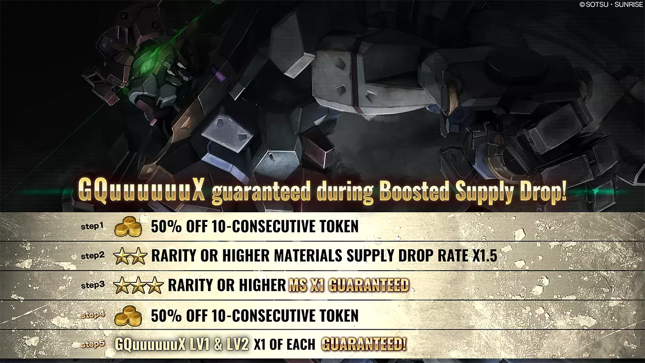 ■活动时间 [太平洋标准时间] 2026年1月8日 00:00 – 2026年1月14日 20:30 [已计划] [中欧时间] 2026年1月8日 09:00 – 2026年1月15日 05:30 [已计划] ■活动内容 本次补给箱活动中,可进行最多5阶段的10连补给箱抽取。 每次抽取将使阶段提升1级,顺序为阶段1→阶段2→阶段3→阶段4→阶段5。 阶段5完成后,限时提升补给箱活动结束。 ・阶段1(15代币):代币50%折扣! ・阶段2(30代币):★★稀有度及以上材料掉落率1.5倍! ・阶段3(30代币):必出1个★★★稀有度及以上MS! ・阶段4(15代币):代币50%折扣! ・阶段5(30代币):必出1个Hardygun LV1! ※抽取内容与当前进行中的补给箱相同。详情请查看【物品列表】。 ※请务必确认活动日程,以免错过任何内容。 ■GQuuuuuuX 保底阶梯补给 自[太平洋标准时间]2026年1月8日/[欧洲中部时间]2026年1月8日起,GQuuuuuuX LV1和LV2保底阶梯补给将开启。