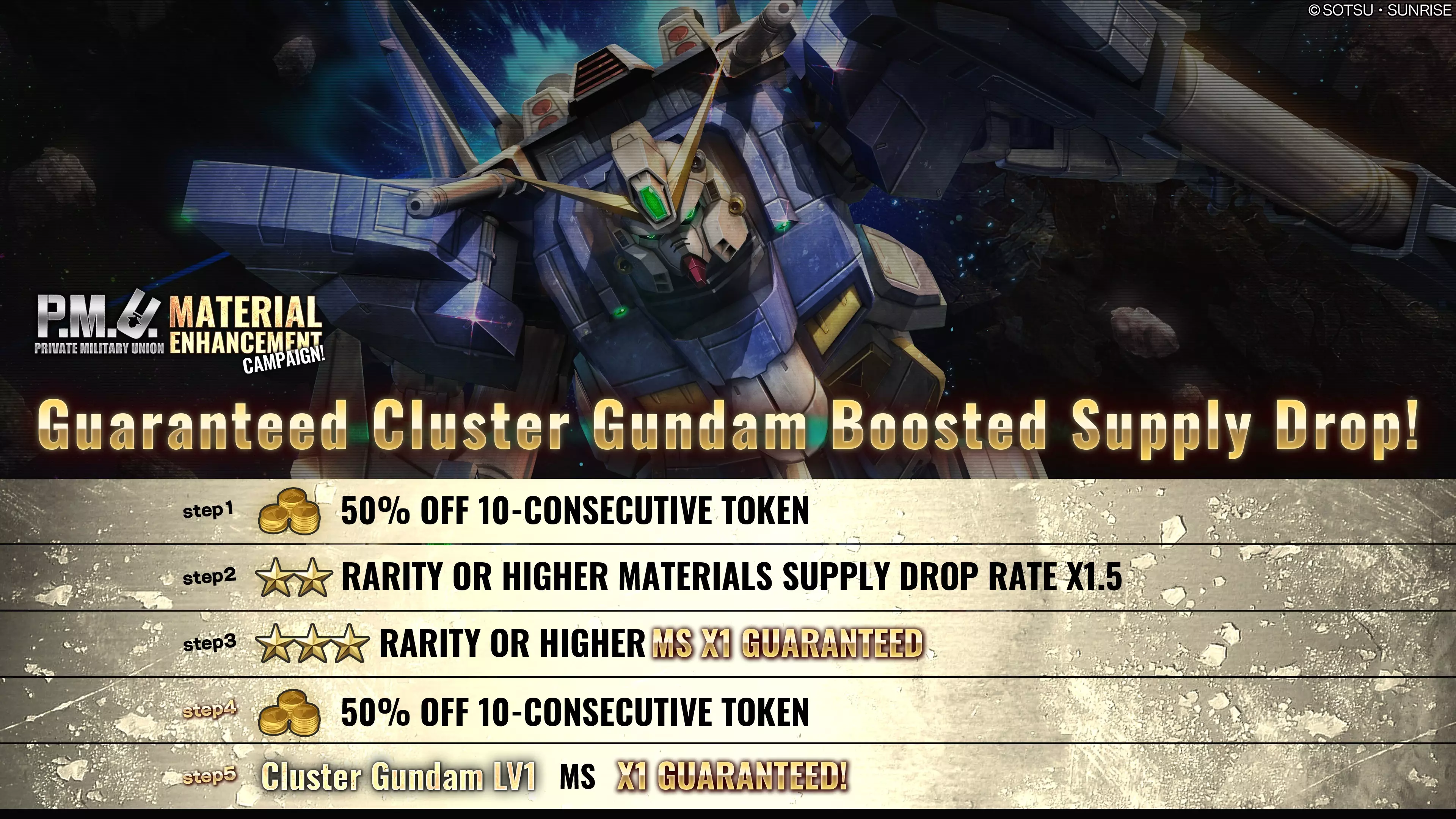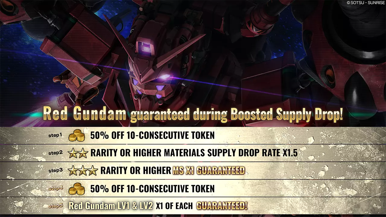 ■活动时间 [太平洋标准时间] 2026年1月15日 00:00 – 2026年1月21日 20:30 [已计划] [中欧时间] 2026年1月15日 09:00 – 2026年2月22日 05:30 [已计划] ■活动内容 本次补给箱活动中,可进行最多5阶段的10连补给箱抽取。 每次抽取将使阶段提升1级,顺序为阶段1→阶段2→阶段3→阶段4→阶段5。 阶段5完成后,限时提升补给箱活动结束。 ・阶段1(15代币):代币50%折扣! ・阶段2(30代币):★★稀有度及以上材料掉落率1.5倍! ・阶段3(30代币):必出1个★★★稀有度及以上机动战士! ・阶段4(15代币):代币50%折扣! ・阶段5(30代币):必出1台Cluster Gundam LV1! ※抽取内容与当前进行中的补给箱相同。详情请查看【物品列表】。 ※请务必确认活动日程,以免错过任何内容。 ■红色高达保底阶梯补给 自[太平洋标准时间]2026年1月15日/[欧洲中部时间]2026年1月15日起,红色高达LV1&LV2保底阶梯补给将开启。