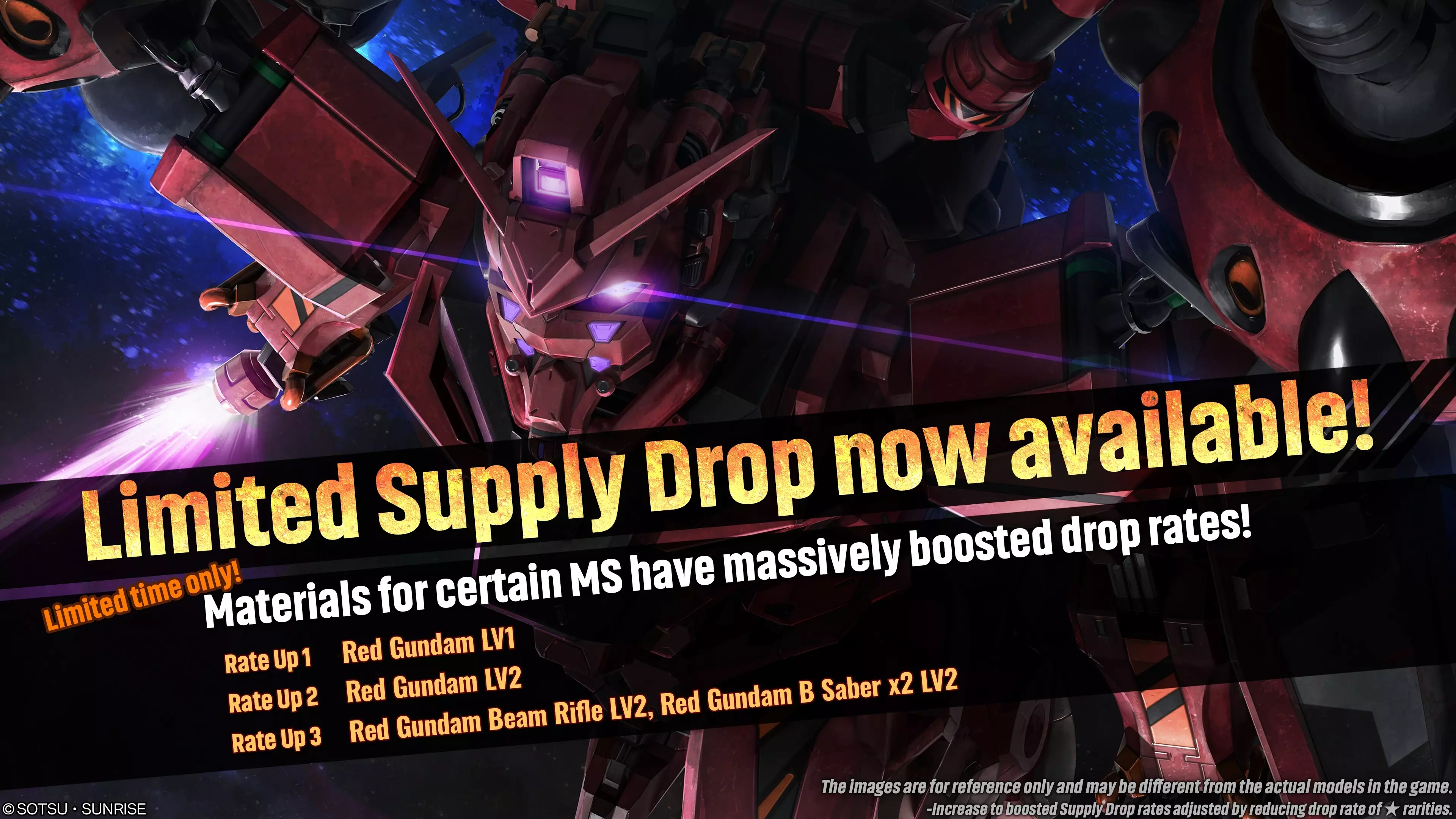 ■活动时间 [太平洋标准时间] 2026年1月15日 00:00 – 2026年1月21日 20:30 [已计划] [中欧时间] 2026年1月15日 09:00 – 2026年1月22日 05:30 [已计划] ■活动内容 活动期间,可在物资柜台请求【限定补给箱(单次/十连)】。 限定补给箱中,红色高达的掉落率将提升。 ■补给掉落率大幅提升的重点物资 限定补给箱中,各机体等级和武器的掉落率将分别受到影响。◎补给掉落率提升①(物品数量1) ・★★★红色高达LV1(突袭单位,地/空两用,cost:500) ◎补给掉落率提升②(物品数量1) ・★★★红色高达LV2(突袭单位,地/空两用,cost:550) ◎补给掉落率提升③(物品数量2) ・★★红色高达光束步枪LV2 ・★红色高达B光剑×2 LV2 ■受掉落率提升影响的补给 ・限定补给 ※本次限定补给可获得的材料与当前普通补给的阵容相同。与标准补给不同的是,限定补给中只有指定物品会获得掉落率提升。※限时补给箱的掉率提升对各等级单位及单位的主武器影响不同。 1-2级单位和武器的掉率提升如下: ・1级单位掉率提升3% ・2级单位掉率提升3% ・主武器掉率提升3% 补给箱掉率提升是通过降低【★】稀有度物品的掉率实现的。 ※关于限时补给箱的详细物品列表,请查看【物品清单】。 ※请求限时补给箱所需的代币数量与普通补给箱相同。(1次 – 3代币 / 10次 – 30代币) ※请务必查看活动日程,以免错过任何内容。 ■回收计数器新增可兑换材料 ⇒ 新增材料相关信息 ■机体 ・新增★★★ Z高达3A 型 LV1–2 ・新增★★★ 迪杰[卢欧商会型] LV1–2 ・新增★★★ 高达Mk-V[MP装备型] LV1