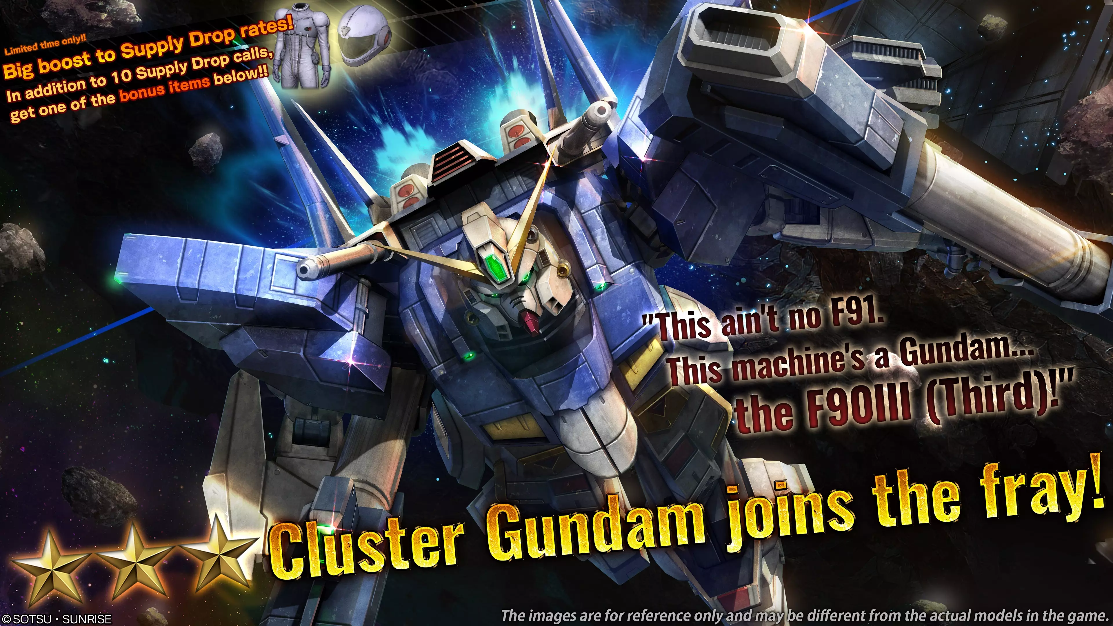 ■活动时间 [太平洋标准时间] 2026年1月15日 00:00 – 2026年1月21日 20:30 [已计划] [中欧时间] 2026年1月15日 09:00 – 2026年1月22日 05:30 [已计划] ■新增内容 ■机体 ・★★★ 聚簇高达 LV1(突袭型机体,可在地面/宇宙使用,cost:750) ※上述MS(机动战士)可参与月度MS Bonus Unit活动。 ■机动战士特点 ・cost为750的突袭型机体。 ・这是基于F90III开发的原型机,作为战略海军研究所“Formula Project”的最终成果。 ・其型号末尾的“Y”(F90IIIY)代表“Young Star”,是26种可选方案之一,该MS可说是专为特定任务组件而优化。其武装包括光束步枪、兼容【重击】技能的光束军刀,以及威力强大的 mega 光束火箭筒。还配备了光束盾牌,不仅具备防御功能,还可作为投射武器投掷。此外,本机凭借高机动性,在突击作战中表现出色。合理运用其多样化武装,有望发挥显著的战斗效能。 在宇宙巴比伦尼亚战争结束后,本机由沃尔夫·莱尔少尉驾驶,执行摧毁边境一号星上遗留的 SNRI 物资的任务,并与死亡枪手部队展开对抗。 可在地面和宇宙两种环境下部署。※本视频内容可能与实际产品存在差异。 ※请务必留意活动日程,以免错过任何内容。 ■十连补给额外奖励:限定驾驶员道具 自[太平洋标准时间]2026年1月15日00:00/[欧洲中部时间]2026年1月15日09:00起,进行十连补给可额外随机获得1个限定驾驶员道具。