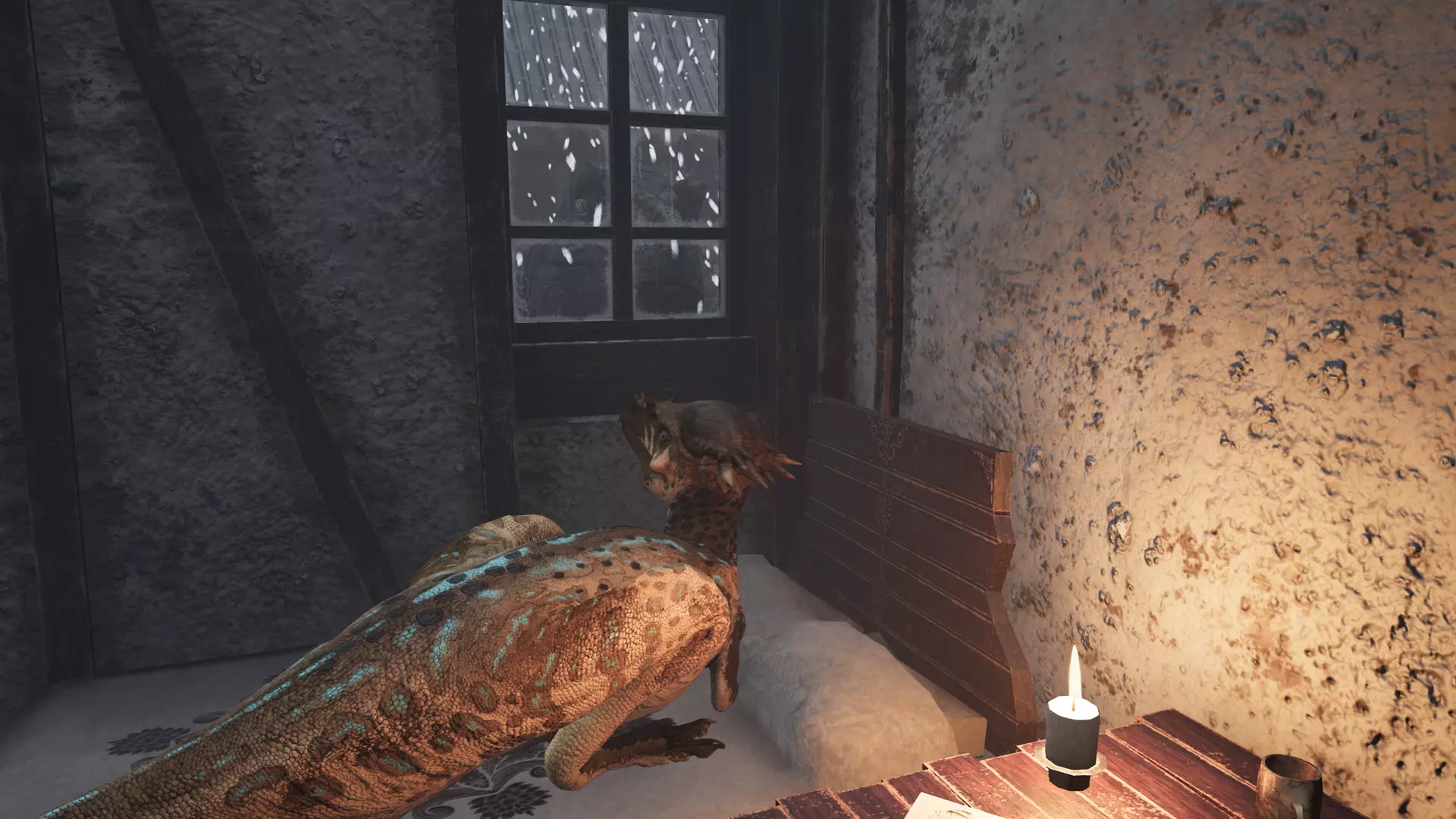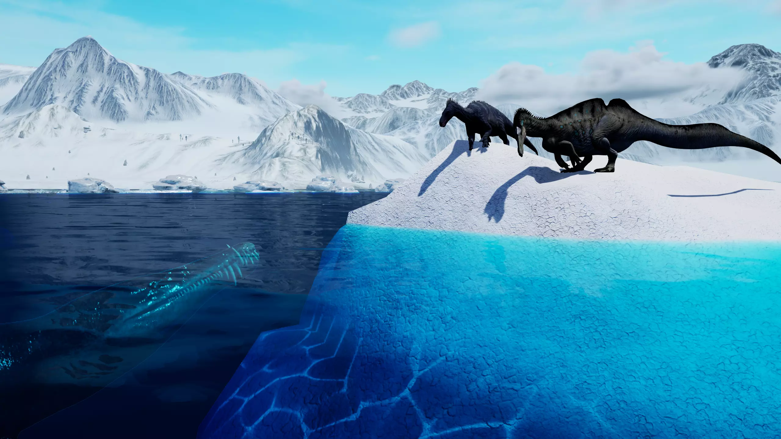 新雪地主题地图:时空漂流 -时空漂流是一个以广阔冰冻湖泊为中心的雪山山谷。在原始状态下,地图自然促使食草动物在湖中冰洞(饮水处)和周围山脉(觅食处)之间迁徙。每个冰洞都将作为独立水源,因此角色不会对湖泊感到厌倦。洞穴现已变为冰洞!高山生物群系的天气已完全调整,地图包含降雪、北极光和暴风雪等元素。 推荐容量:100名玩家 该地图尺寸中等。由于其布局鼓励玩家对战互动,因此旨在成为以冲突为核心的地图。不过,它的规模也足够大,可轻松用作小型服务器的生存或角色扮演体验。难度:困难 未经修改的情况下,这张地图的设计初衷就是具有挑战性。地形充满危险,夜晚漆黑一片,大地寒冷刺骨。旅行是必不可少的,但在积雪之下,庇护所可能难以被发现。正如这片永恒寒冬之地的特点,玩家将在这片严酷的冰封山地景观中,考验自己的生存技能。 【集中式清洁水源与霜怒的登场】 最大的水域现在位于地图中央,形成一个巨大的冰冻湖泊!海水仍可能从下方上涨并淹没地图。这是我们首张并非以无限广阔区域为边界的岛屿地图!相反,地图会将你传送到一个名为【凛怒】的特殊生物群系。这里有着无情的风暴,它会无视所有舒适效果,模糊你的视野,并将你传送到地图的另一端。 这些传送点是固定的,因此这并非逃离战斗的有效方法。如果两名玩家在同一地点进入【凛怒】,他们也会从同一地点出来! 互动材质位移 地图上覆盖着特殊的雪,这些雪采用了互动材质位移技术!通俗地说,这意味着当你在雪中行走时,雪会对你角色的移动做出反应。我们之前在一些小型独立物体上使用过这种技术,比如缇坦尼亚上的泥地,但这次的实现是将该逻辑适配并整合到了地形材质本身。