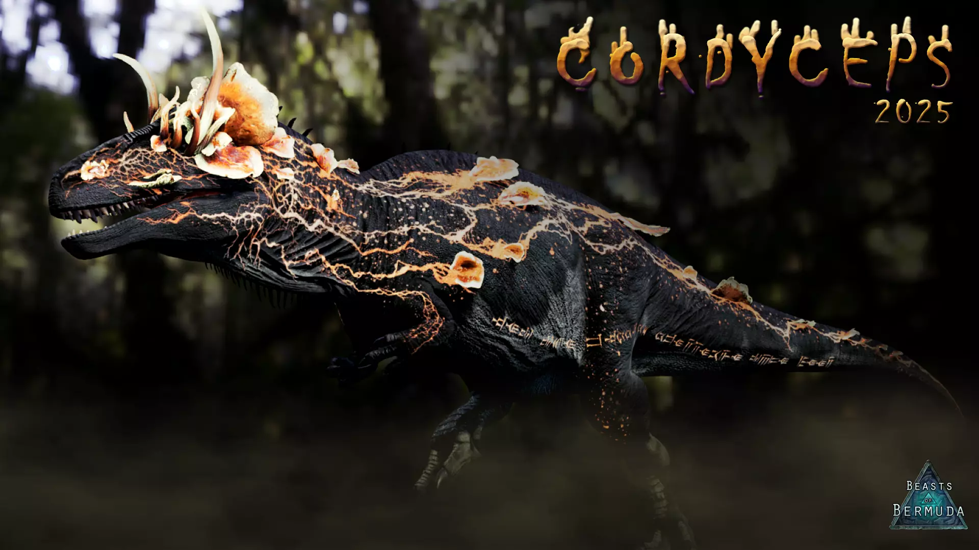 今年包含哪些内容? +限时活动期间,玩家可获取2025年秋季活动皮肤【冬虫夏草高棘龙】,以及往年所有秋季活动皮肤:【冥河渡神南方巨兽龙】和【秋日腐朽霸王龙】。 【冬虫夏草】皮肤由Croww & Valhalla制作。 所有皮肤均带有发光的生物荧光层。 这些皮肤会解锁独立的可装备外观覆盖物:高棘龙和霸王龙的【叶之庇护】,以及南方巨兽龙的【冥河之辉】。解锁的覆盖物可应用于对应物种的任何皮肤上。 高棘龙和霸王龙的活动皮肤附带可装备的网格物体。 【冬虫夏草】皮肤同样适用于其子类:鲨齿龙。