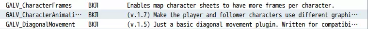 双击空白行并选择插件: GALV_CharacterFrames GALV_CharacterAnimation GALV_DiagonalMovement 确保按此顺序排列: