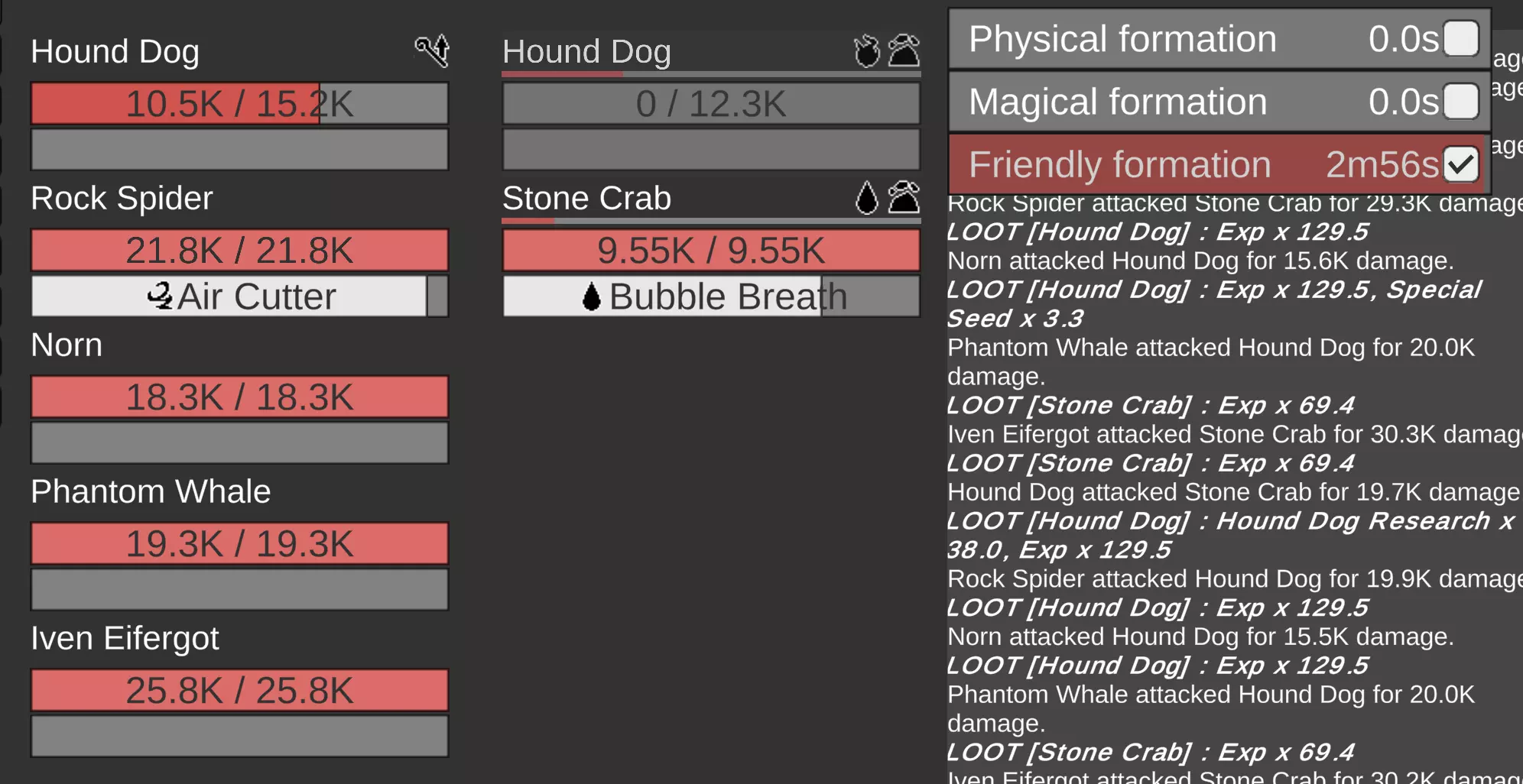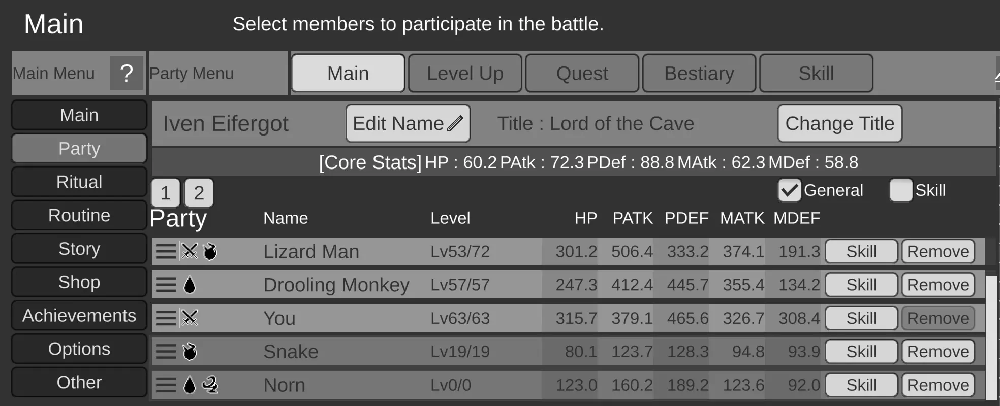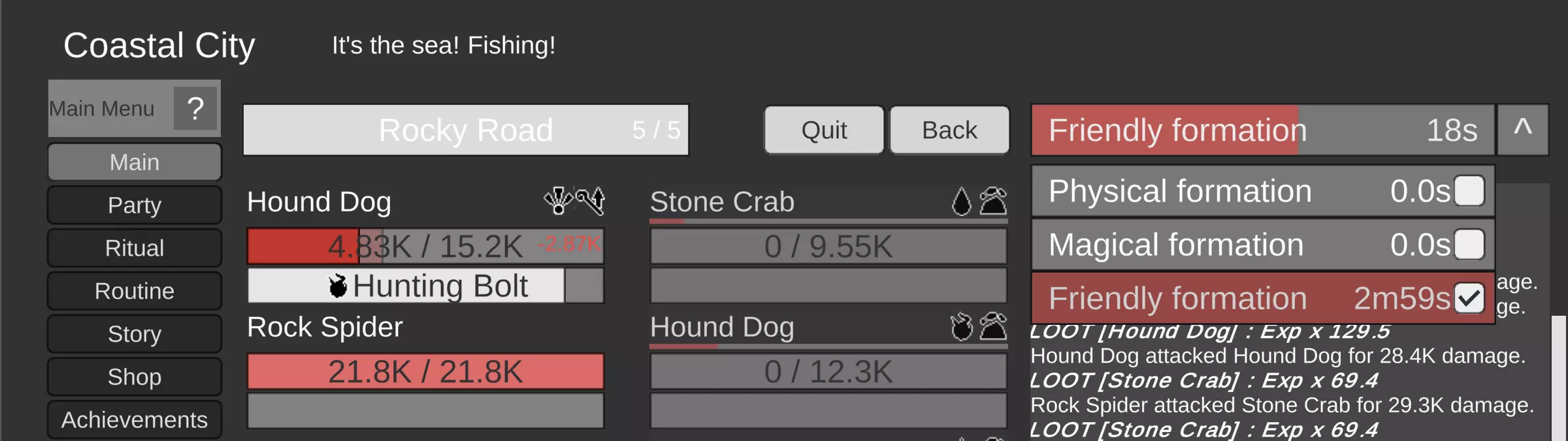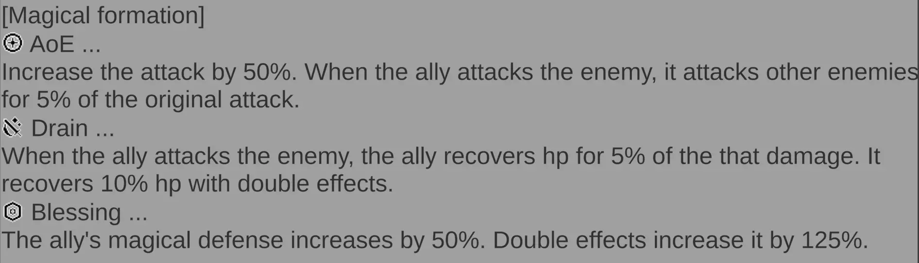 为什么这些技能都不管用!? 这是个合理的问题!但大多数技能只有在你的队伍处于物理、魔法或友方阵型时才会触发。有些技能会一直生效,但远非全部。 这意味着在推进游戏(而非刷怪)的战斗中,你需要更加投入。你可以进入阵型界面,点击✅来让阵型循环生效(我会对友方阵型这么做)。