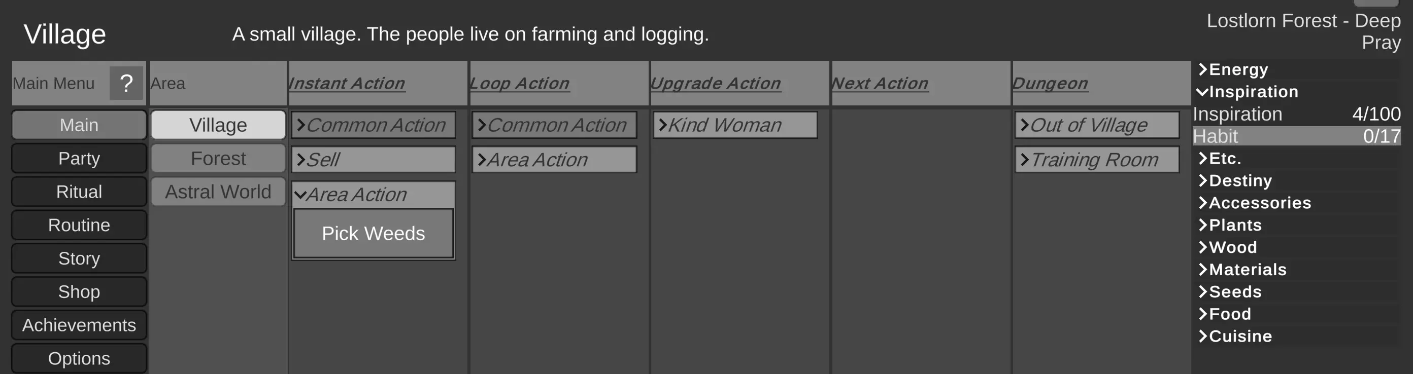 战斗时,你的主动效果会显示在名字旁边(敌人也是如此)。 哎呀!你可能错过了这些…… 在游戏过程中,你的编年史里有很多未说明的内容,但别因此停滞不前! 以下这些物品、属性和功能曾让我困惑了好一阵子——别让你也这样: 日常活动 日常活动能扩展你的能力,让你无需参与循环或区域行动就能更轻松地恢复魔法、耐力和命运等资源。很实用! 除能量外,所有日常活动的收益在黑暗仪式后都会归零。 我建议始终运行“崇拜”并点击几次习惯来获取经验。