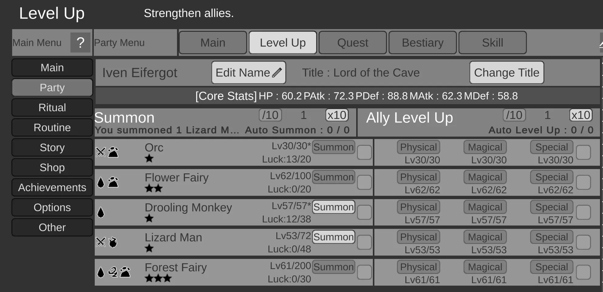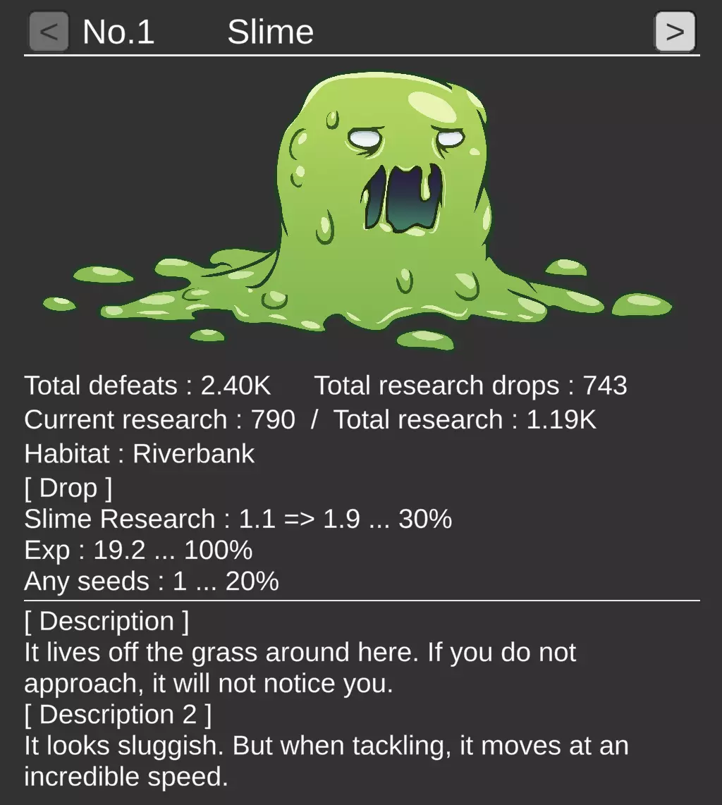 查看这张史莱姆的截图,你会看到“史莱姆研究 1:1 --> 1:9...30%”。 这个30%表示击败史莱姆后获得史莱姆研究的基础掉落概率。 在你的图鉴中为任何生物积累足够的研究后,你现在就可以召唤它了!召唤是永久性的,该生物将永远可供你使用。 【可能的混淆点】:队伍标签上的“召唤”并非指召唤。它的意思是该生物的升级。当你点击任何生物(或你自己)的“召唤”按钮时,你是在为该存在提升能力。 如何添加新的队伍生物以及升级你的队伍生物
