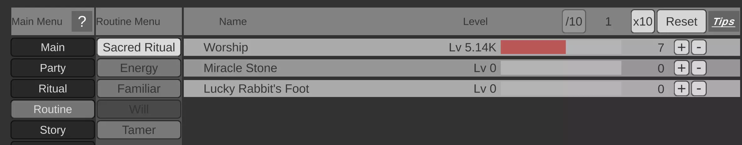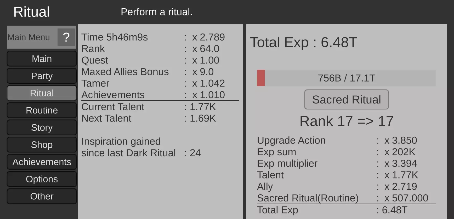 黑暗仪式实际上有什么作用? 黑暗仪式会将你的等级重置为零,并重置大部分类别的日常收益,但能量除外。这听起来可能不太好,但实际上并非如此。我花了很长时间才意识到,要在游戏中取得进展,这是必要的步骤。 我建议当你的天赋比上次高时,在等级3、5、10、15和20级进行重置。 使用名为“崇拜”的神圣仪式日常活动来增加这里的经验值收益!记得经常点击以保持其运行。