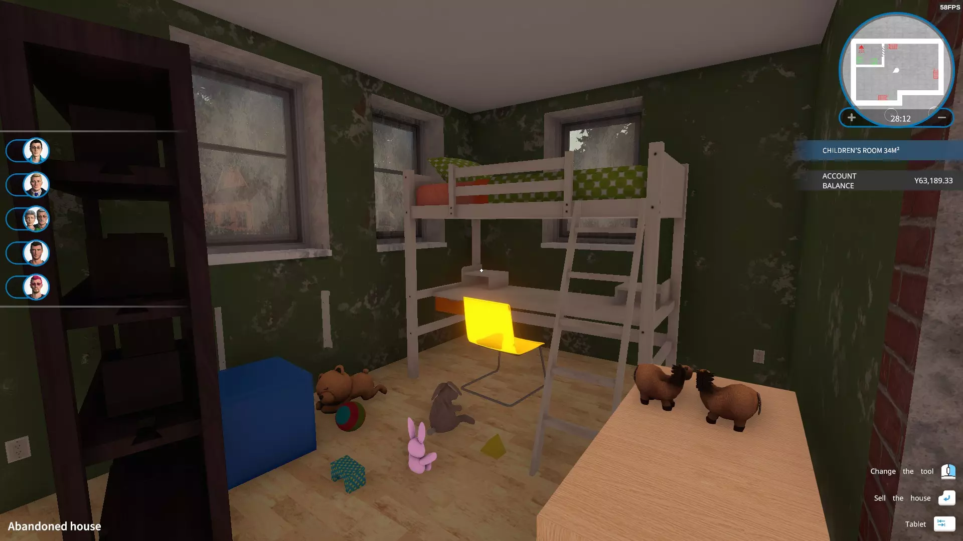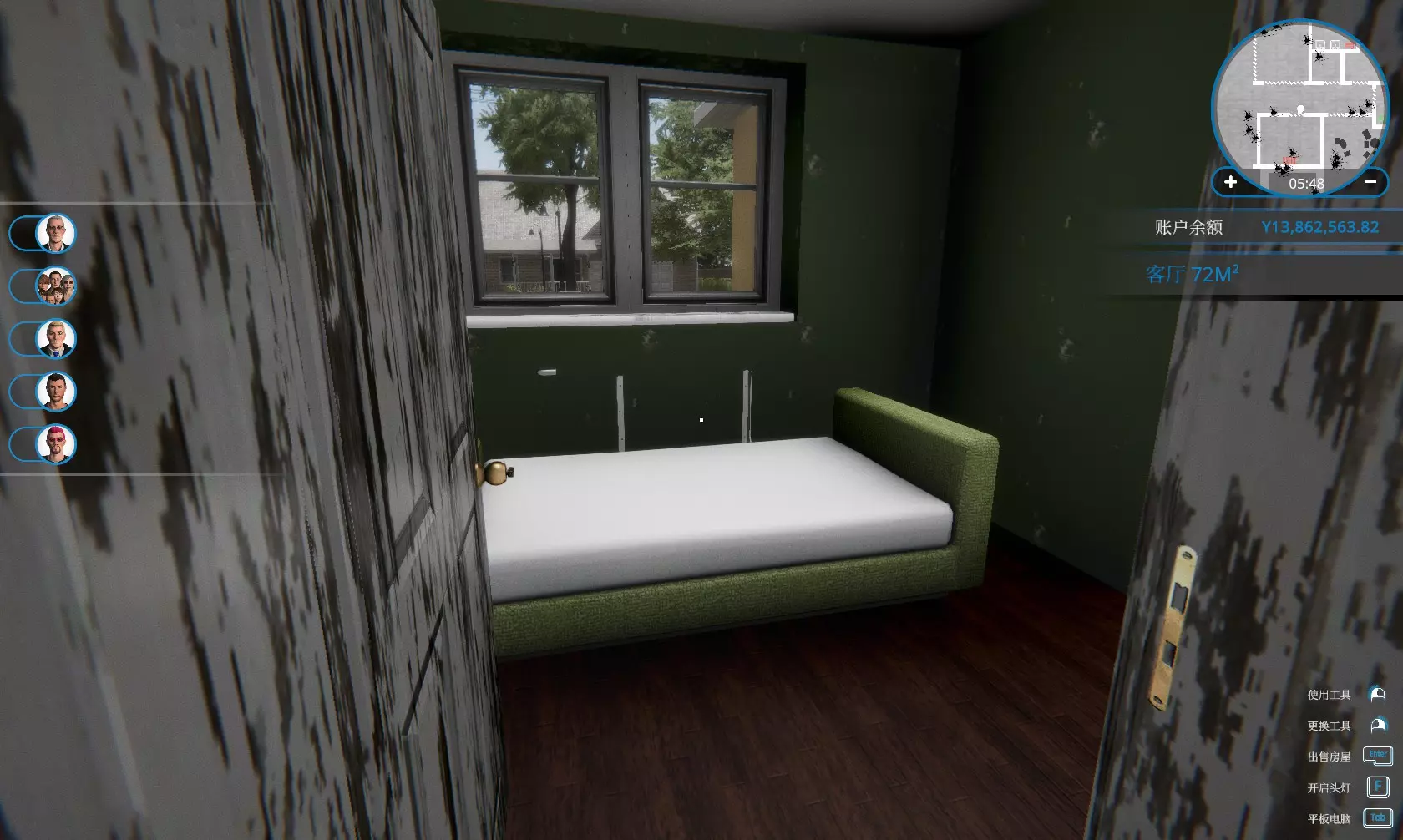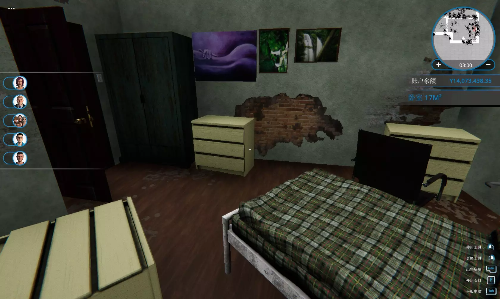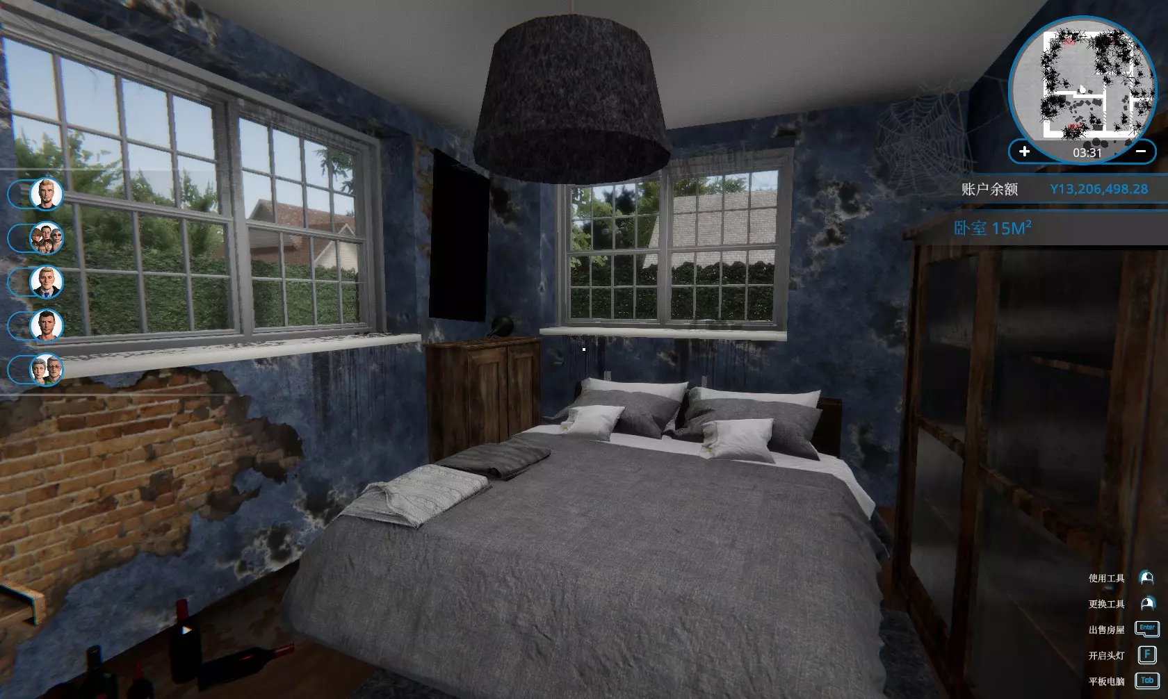 卖一栋房子给“张 崔”。 这个人的喜恶由于中文翻译有问题,只能看到一句话:“我并不梦想住在一个得睡在地板上的房屋...”。 由英文版得知喜好如下: 有且只有一个卧室 有地方可以睡觉(指有床或可以当床用的沙发) 有足够的地方可以放书(约2个或以上书柜) 卧室里靠近床附近有地方可以学习(书桌放床边) 方法: 购买“被抛弃的房屋”,里外打扫干净(地图上所有的污渍都清除,蟑螂窝除掉,窗户不用擦,暖气片不用装) 把所有的家具卖掉(包括床,灯,厨房的所有东西,厕所的淋浴室,尤其是墙上的开关,否则砸墙时会掉到地上变成垃圾)保留马桶和洗手池即可。将除厕所以外的房间打通成一个大房间(把门卖掉,门上方的上墙敲掉即可)。在大房间里放置:1个书桌+1张椅子+1个书柜+1张单人双层床含书桌+8种玩具(玩具种类越多越好,一直放玩具直到张崔变成第一名)。