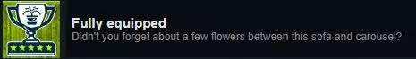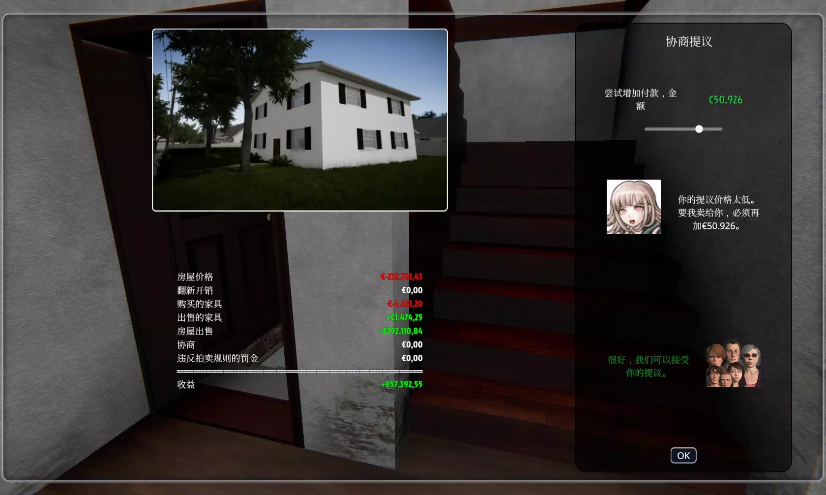 在房屋拍卖协商时至少赚到5万欧元。(设置里可以调货币单位) 此成就建议先点满协商技能,并把货币单位调成欧元。 方法:购买【新婚夫妇的房子】 清洁所有污渍 安装好所有房子里缺少的设备 一楼的两个房间各放一张最贵的【牡丹花床】和一张最贵的【图形地毯】 带小厨房的客厅塞满最贵的沙发、厨具和电视 楼上的四间房每间房各放一张最贵的【牡丹花床】和一张最贵的【图形地毯】 地下室可以造墙隔开,改装出一个家庭影院或家庭图书馆 拍卖房子,协商提议调整到5万欧元出头,不要太多 最后祈祷成功
