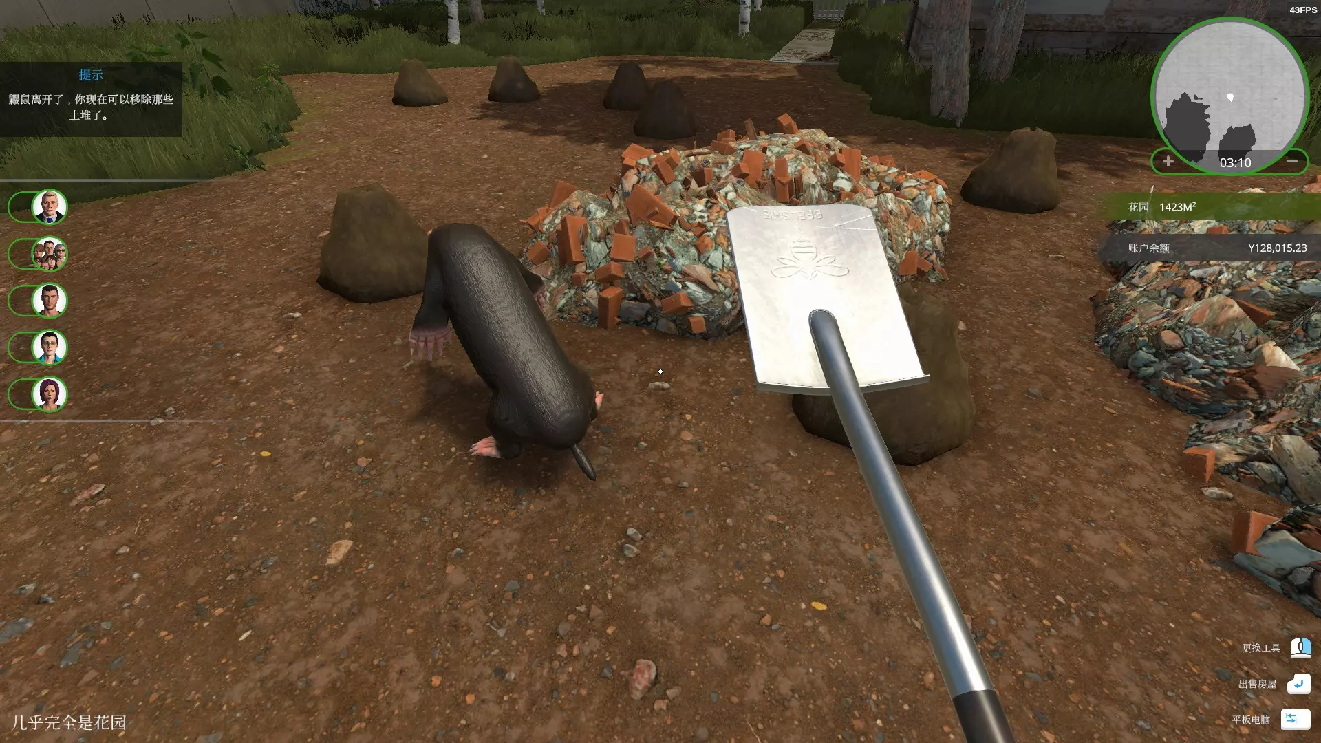 找到一次鼹鼠,建议在【几乎完全是花园】的房子里进行,这里的土堆比较容易寻找(到处寻找土堆并铲挖,总会铲出来的)。土堆的样子如下: