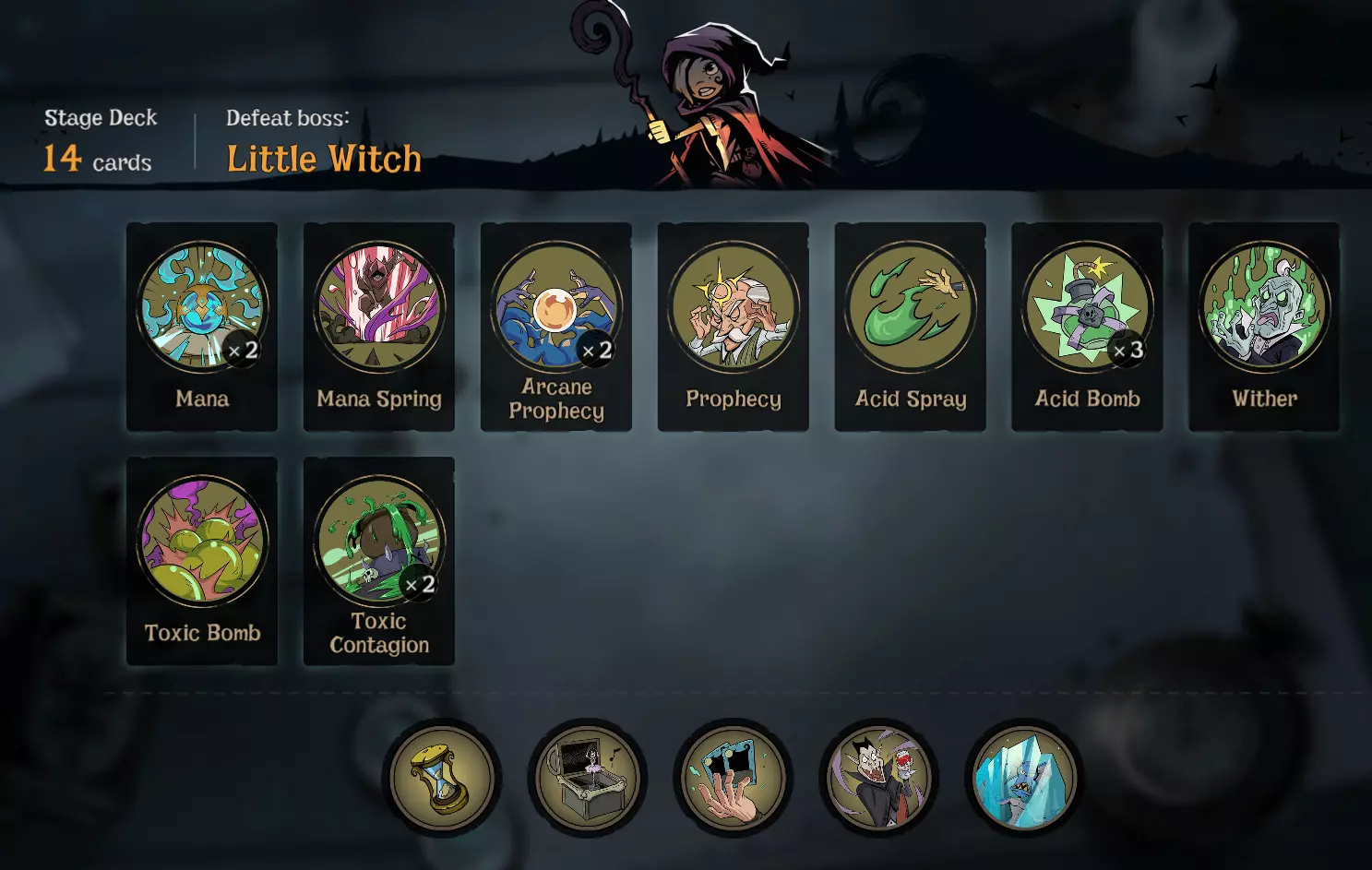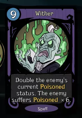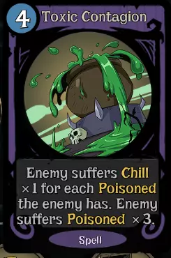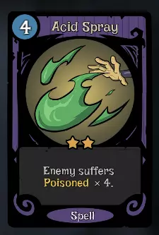 这套构筑如何运作? 1. 用酸液喷射或酸液炸弹给敌人上毒(至少5层) 2. 用毒性蔓延给敌人上寒冷(至少5层) 3. 结束你的回合→你获得新回合,敌人失去部分寒冷 4. 重复上述步骤 5. 用毒性炸弹击杀敌人,或不使用任何卡牌直至敌人回合 其他卡牌 以下是一些你可以使用的优质卡牌: 【法力】 - 智慧 - 灵感 【行动】 - 超级 hex - 循环往复 - 预言 - 附魔 【法术】 - 冰霜新星 - 毒性炸弹 示例卡组