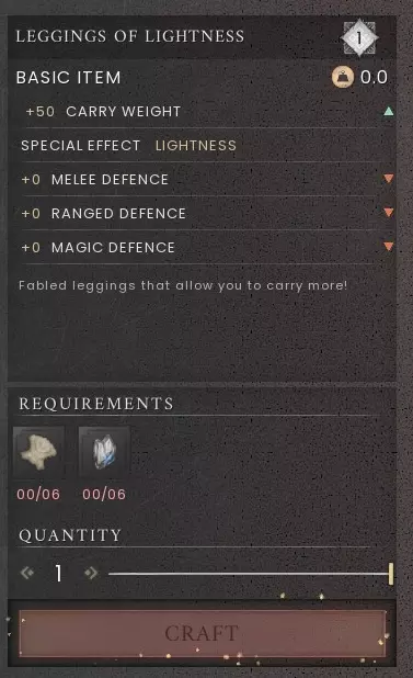 右键点击该物品进行【研究】,可获得轻盈护腿的配方。 制作 stations:制作台 所需材料:粗糙动物毛皮 x6、符文精华 x6