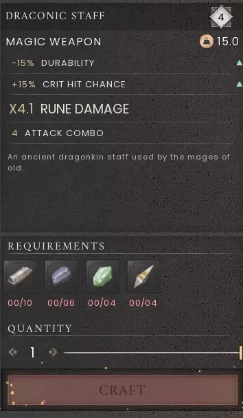 研究【堕落披风】以获取配方 制作 station:制作台 所需材料:无 属性:+2 近战防御,+2 远程防御,+2 魔法防御 龙疫盾牌(4级) 制作 station:锻造铁砧 所需材料:龙首 x1,抗龙盾牌 x1,宝库碎片 x12,宝库核心 x1 暗影剑(5级) 在 Fellhollow 中击败 Zorges 后稀有掉落 制作材料:灵魂碎片 x64,龙皮 x5,精线 x4,宝库碎片 x6 制作 station:锻造铁砧 武器类型:巨剑 追击戒指(5级) 击败绿龙后稀有掉落。右键点击进行“研究”以获取追击戒指的配方