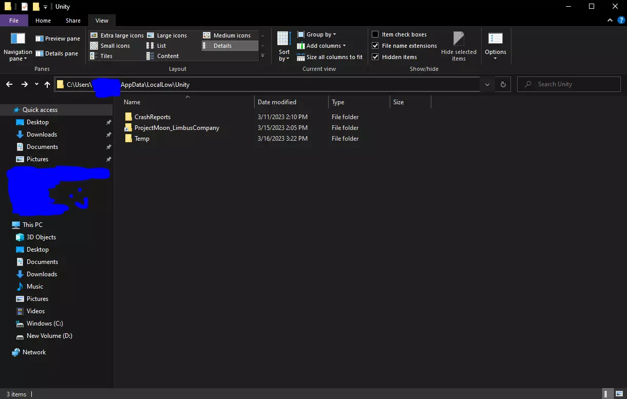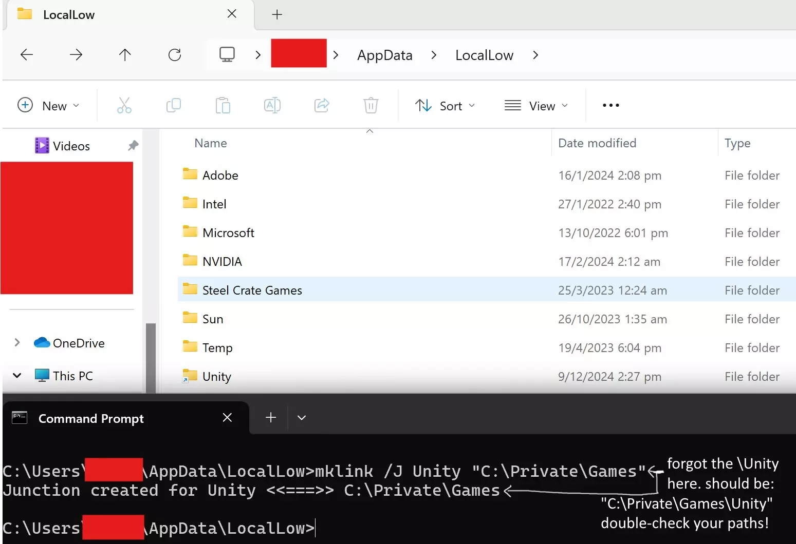 5c. 如果在资源管理器中右键点击时没有“在……中打开”选项,最简单的方法是使用绝对路径。打开Windows菜单,搜索命令提示符或PowerShell并打开终端(可能需要以管理员模式启动)。然后运行以下命令之一: 命令提示符:mklink /J "C: Users <你的用户名> AppData LocalLow Unity" "目标路径 Unity" PowerShell:New-Item -Path "C: Users <你的用户名> AppData LocalLow Unity" -ItemType Junction -Value "目标路径 Unity" 记得将<你的用户名>替换为你电脑上的实际用户名。不要删除引号,否则命令可能无法运行。 6. 如果操作成功……在你的LocalLow文件夹中会创建一个角落带有小快捷方式图标的Unity文件夹。注意,从图片中可以看到,即使你输入了错误的路径,该命令也可能成功执行。请进行检查:打开这个快捷方式Unity文件夹,查看其中是否包含ProjectMoon_LimbusCompany文件夹。 7. 打开游戏并进行测试。 常见问题 问:这个命令有什么作用? 答:简单来说,它只是在AppData位置创建一个指向你想要放置文件夹位置的“入口”。完成此操作后,如果你打开Unity文件夹,Windows资源管理器中的URL仍应指向AppData位置,尽管现在存储是在你指定的新位置进行的。 问:如何撤销所做的更改?A:由于“传送门”只是在导航时将程序重定向到新位置的技巧,因此删除“传送门”文件就足以移除该链接。完成此操作后,你可以安全地将整个Unity文件夹移回LocalLow。 Q:将游戏文件从SSD移到HDD或反之,对游戏性能有影响吗?比如加载时间、卡顿等。 A:我注意到在HDD上加载时间会稍慢一些,一些用户还报告说这样做后下载时间也会略长。不过这并不足以影响我的游戏体验——但我想,除非你迫切需要SSD上多一点空间,否则不会这样做,所以你应该将此作为最后的手段。 Q:还有其他我应该知道的文件夹吗? A:是的。LC 还会在 LocalLow 文件夹内创建一个 ProjectMoon 文件夹,里面存放着一些……可能是 LC 的 fmod 组件?我不太确定它具体存储了什么内容,但在我看来这似乎是实际的游戏引擎文件……你或许可以对它执行同样的转移操作,不过我个人没有这么做过。 旧版说明变更 该指南过去曾要求用户仅移动 Unity 游戏文件夹内的 ProjectMoon_LimbusCompany 文件夹。然而,许多人发现,在一段时间后、清理缓存或重新下载游戏后,游戏会删除这个解决方法。此外,这在下载过程中也没有帮助,因为 LC 倾向于先下载到旁边的 Temp 文件夹,这使得该解决方法完全失效。