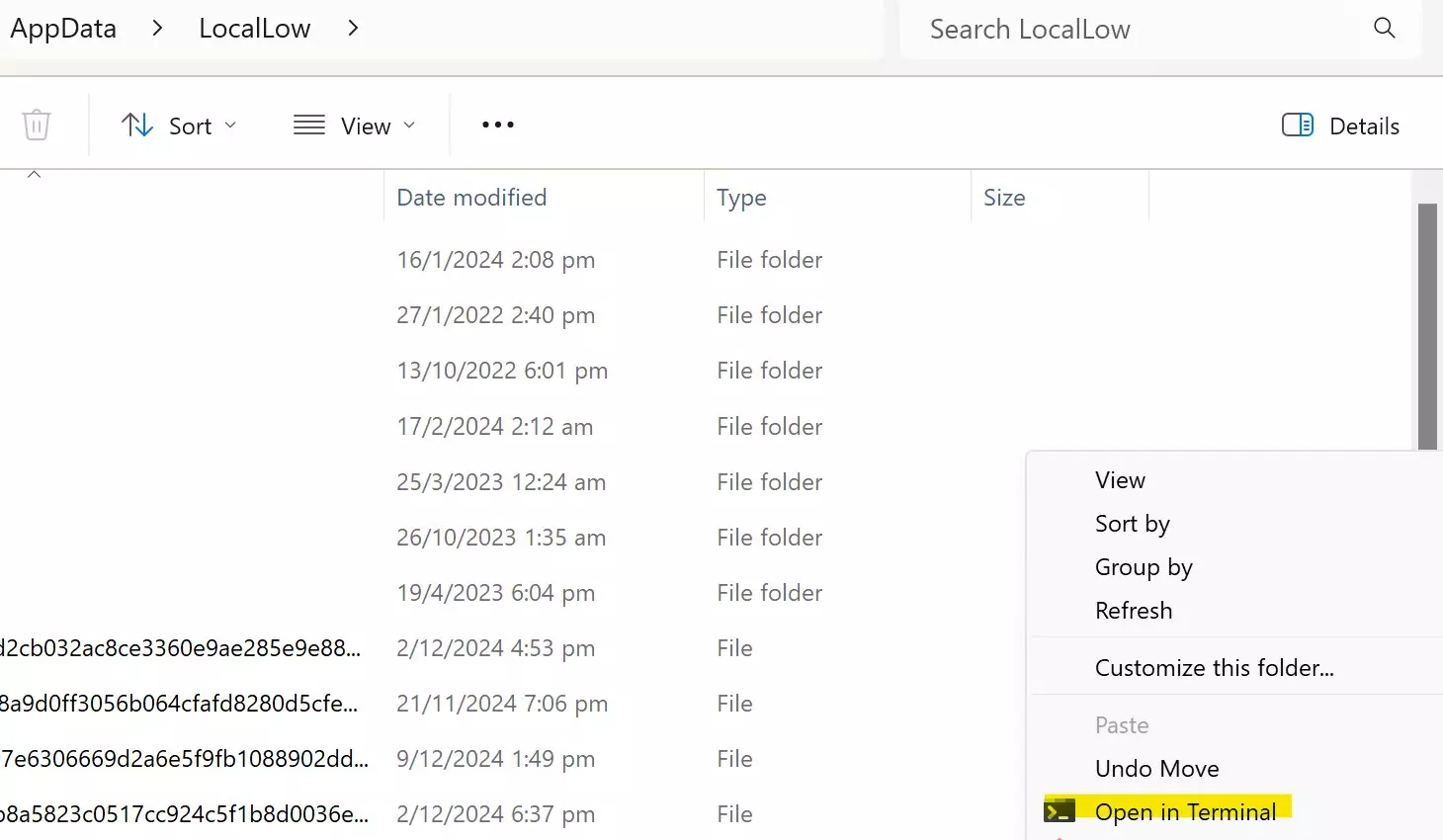 5. 打开本地低权限文件夹的资源管理器窗口。在此文件夹中打开命令提示符/电源外壳——你可以通过按住Shift键并右键单击窗口的空白处,然后选择“在命令提示符中打开”/“在终端中打开”选项来实现。记下你打开的终端名称。