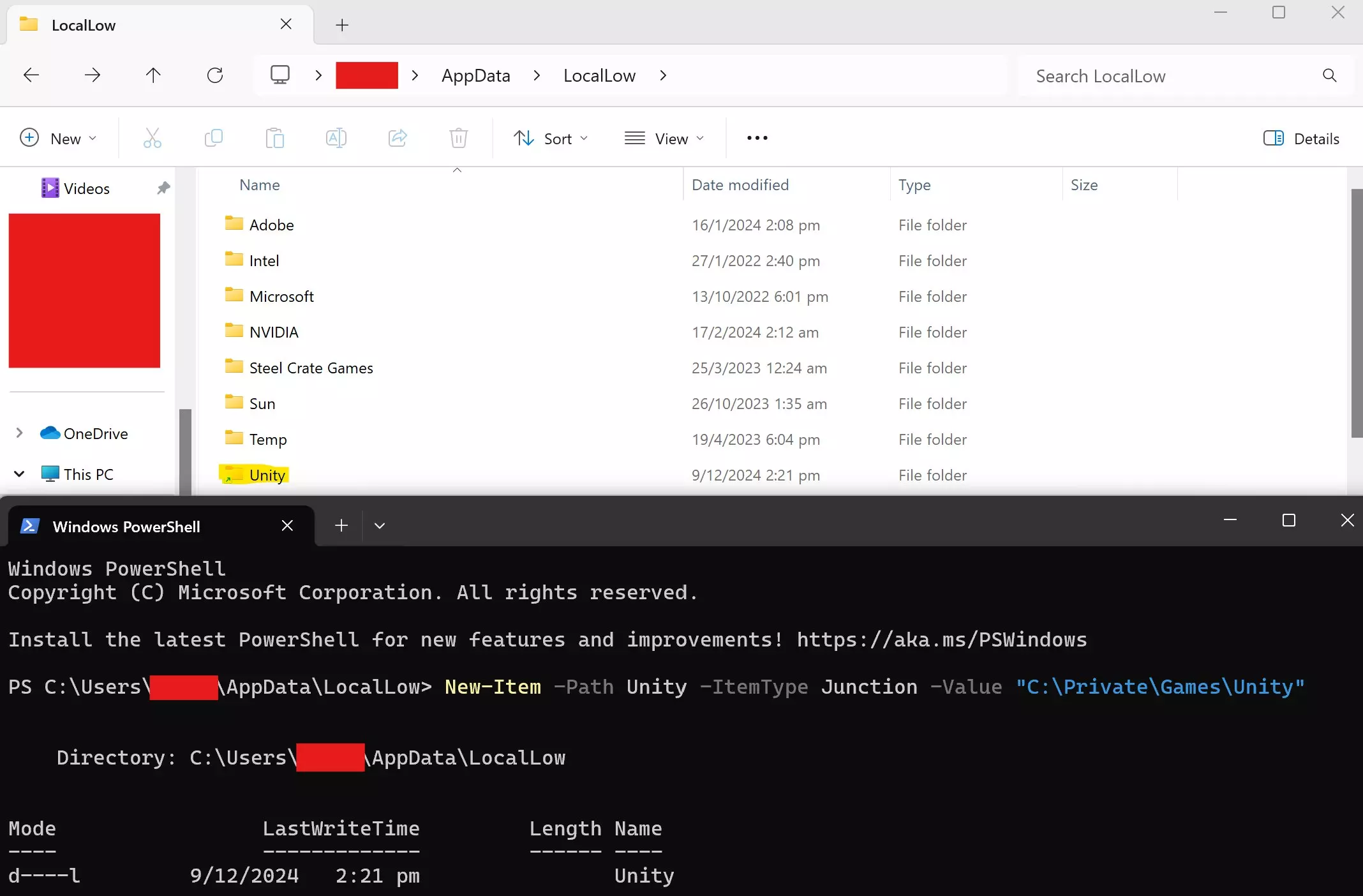 5b. 如果你的终端名称是“Windows PowerShell”,或者之前的命令失败,请使用以下命令:New-Item -Path Unity -ItemType Junction -Value "END PATH Unity"