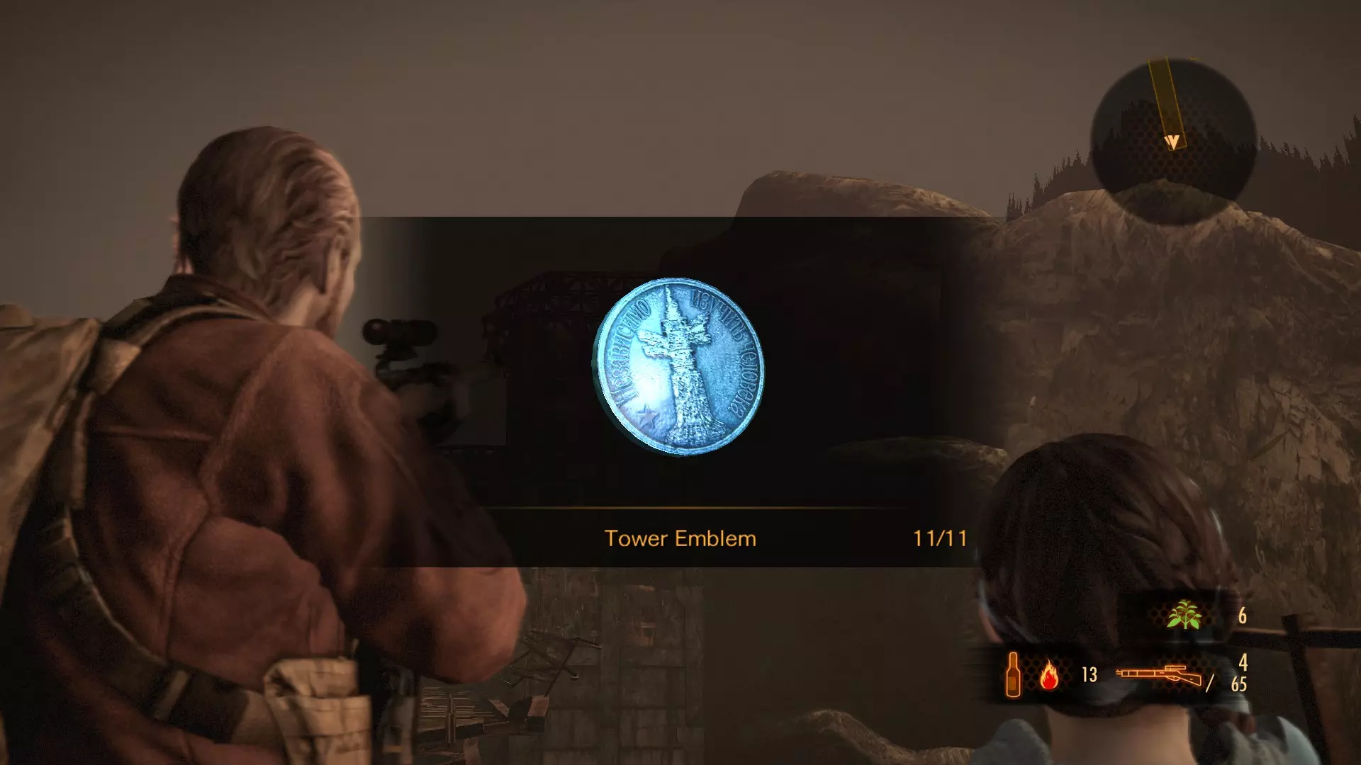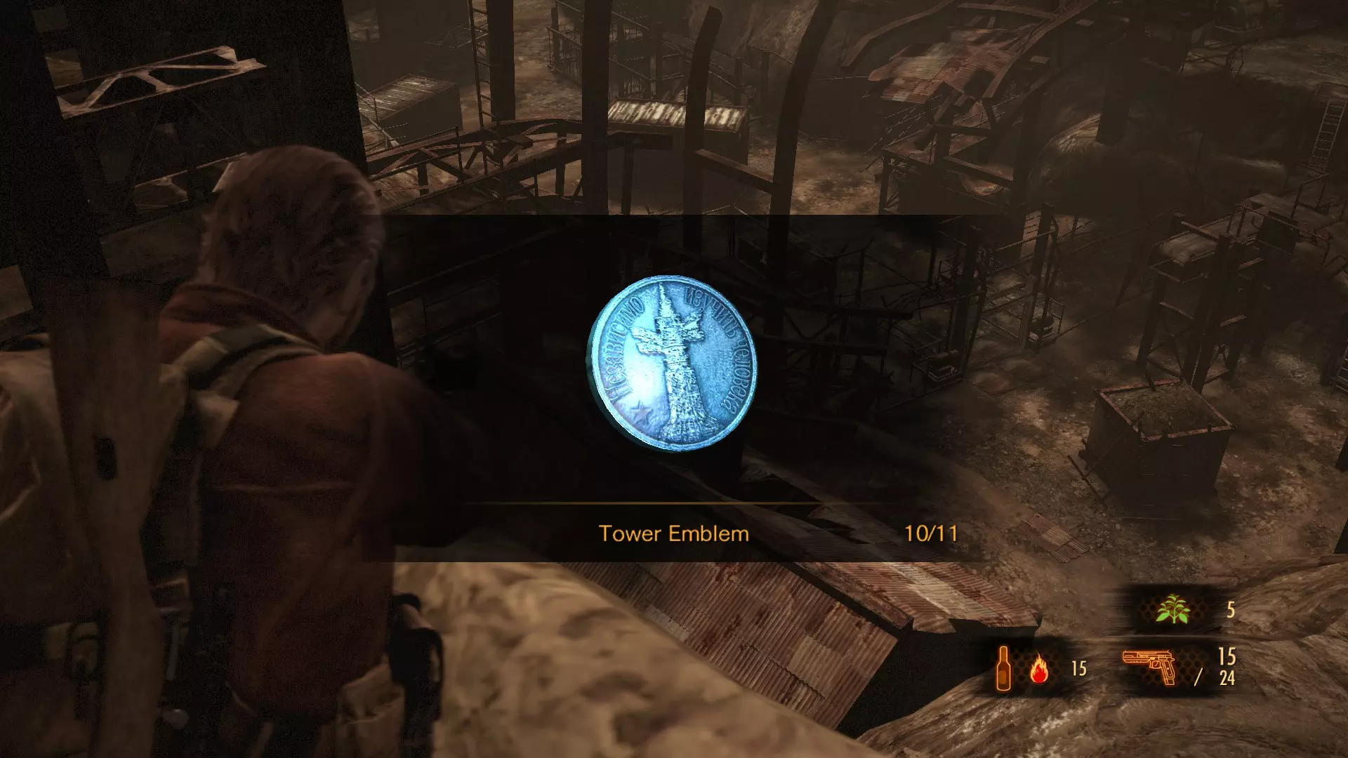 当你到达矿区后,可以从高处俯瞰整个区域。将注意力转向那个撞穿房屋的集装箱。第三个【塔楼徽章】就位于集装箱顶部。 塔楼徽章 #4 (11)