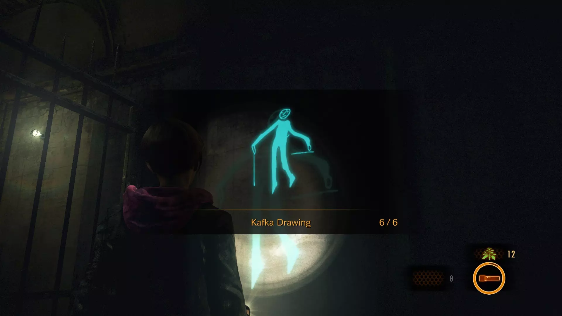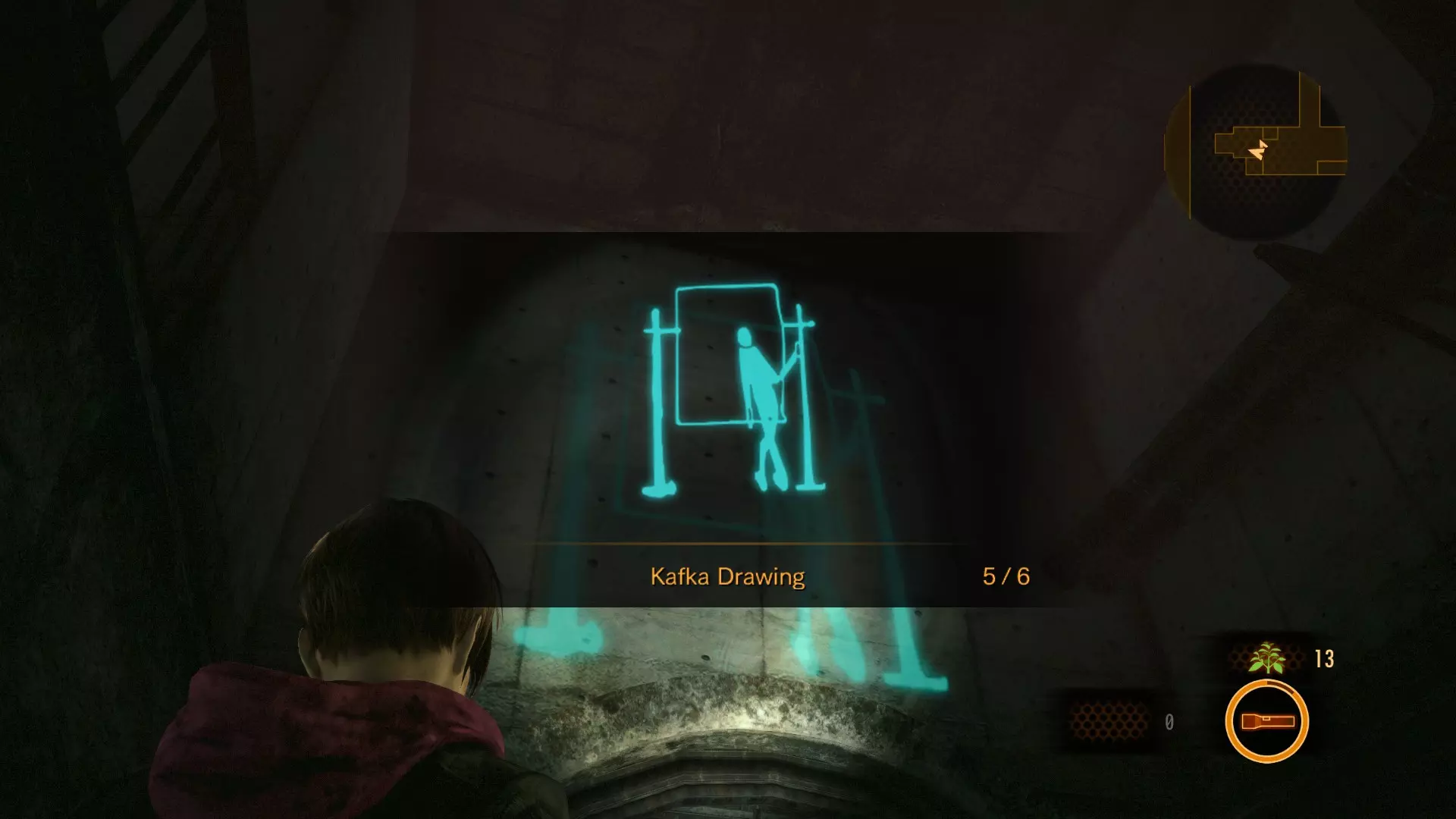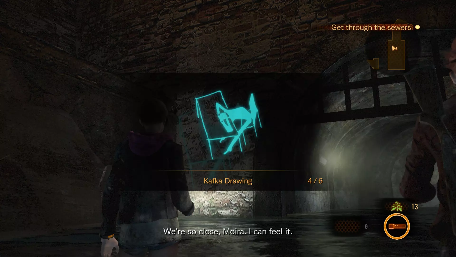 当你穿过下水道时,需要从小瀑布下方通过,然后爬上两个箱子来关闭阀门。在此之前,扫描格栅上方的墙壁,你会在那里找到第五幅卡夫卡画作。 卡夫卡画作#6