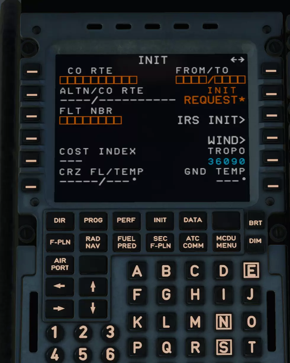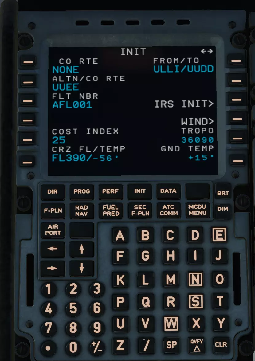 输入ULLI/UUDD并填入FROM/TO窗口。从符号表中获取COST INDEX并填入。我们的飞行高度为39000英尺,即飞行高度层390(去掉两个零即可得到飞行高度层),将其填入CRZ FL。备用机场为UUEE(谢列梅捷沃),填入ALTN。这就是填写完成的INIT页面。