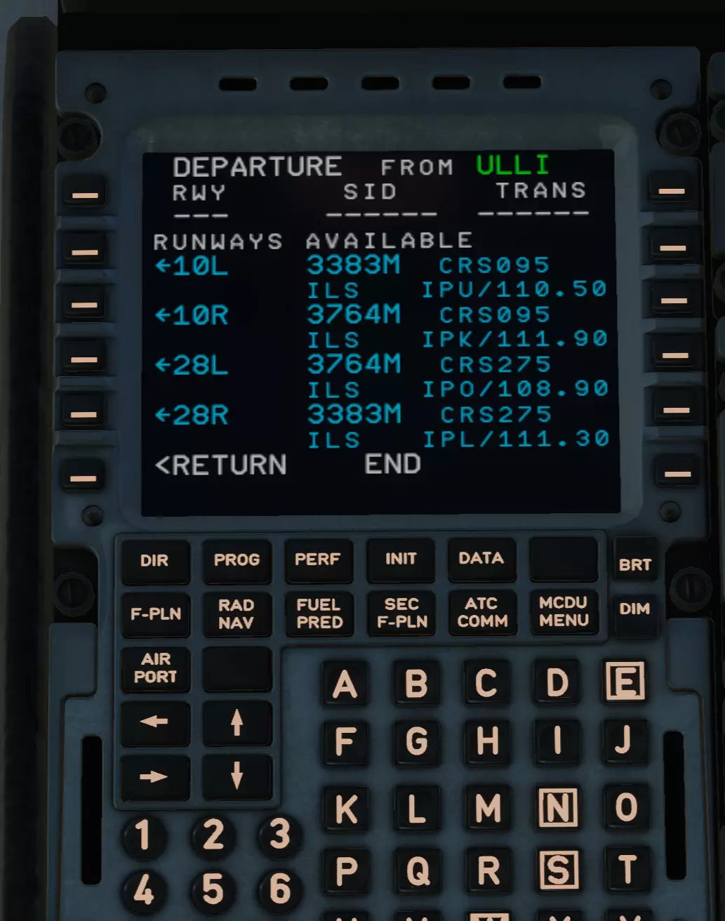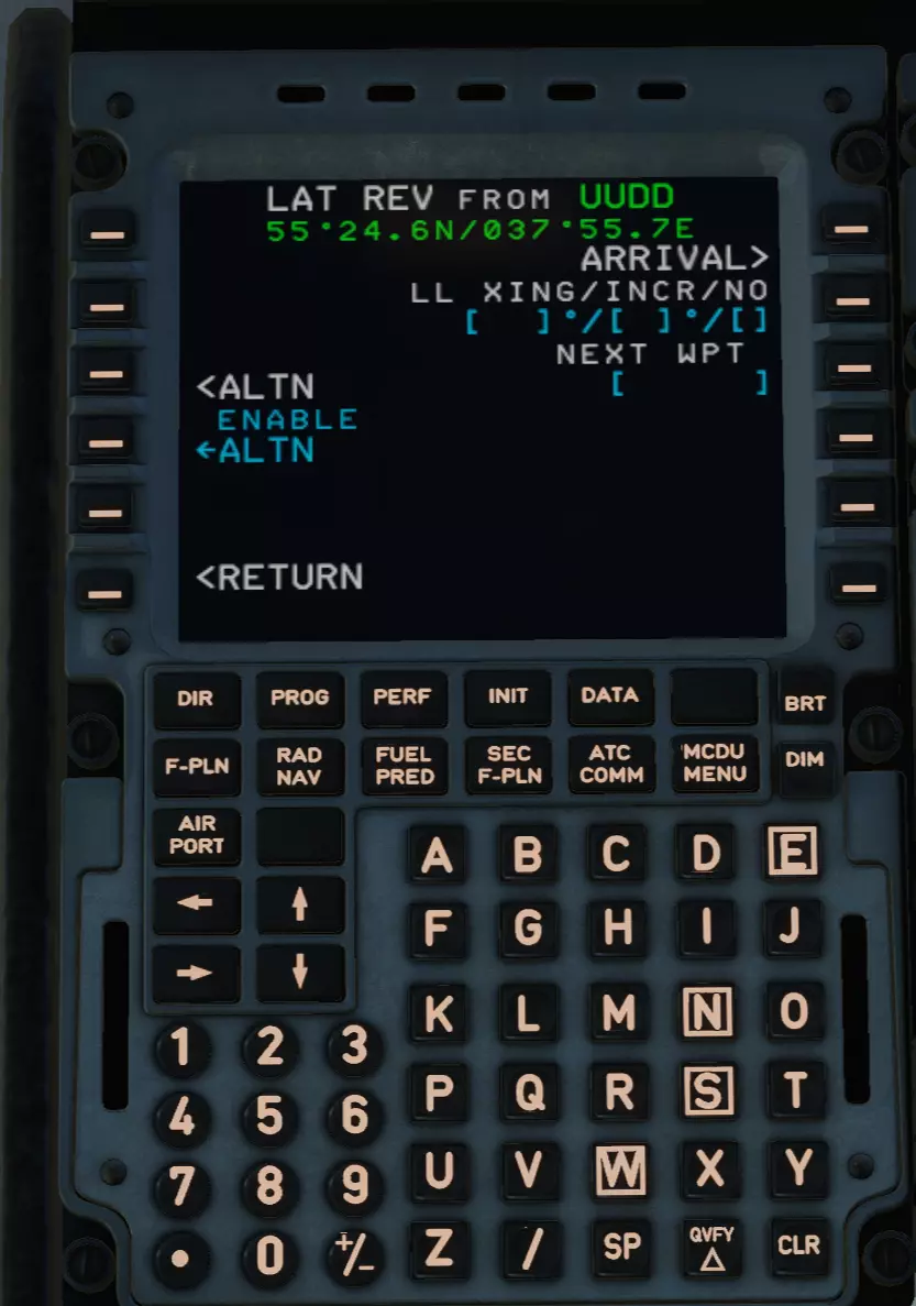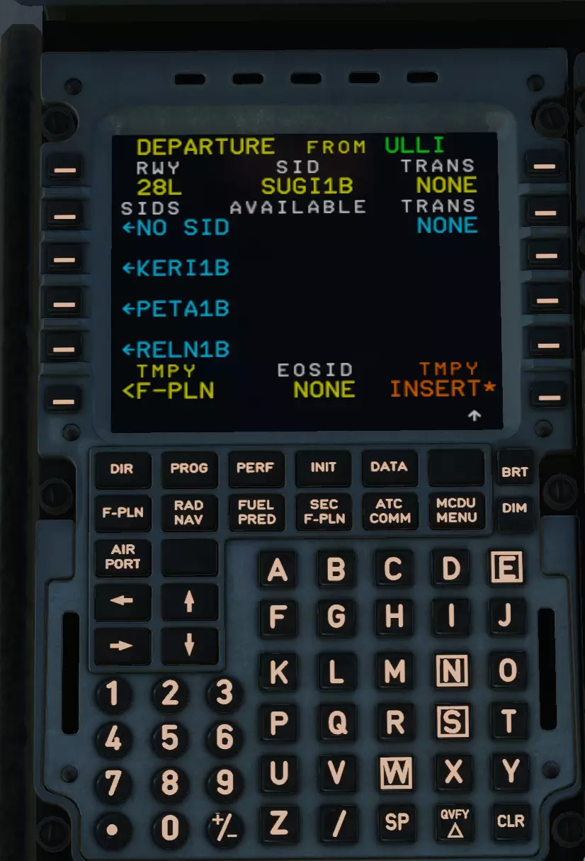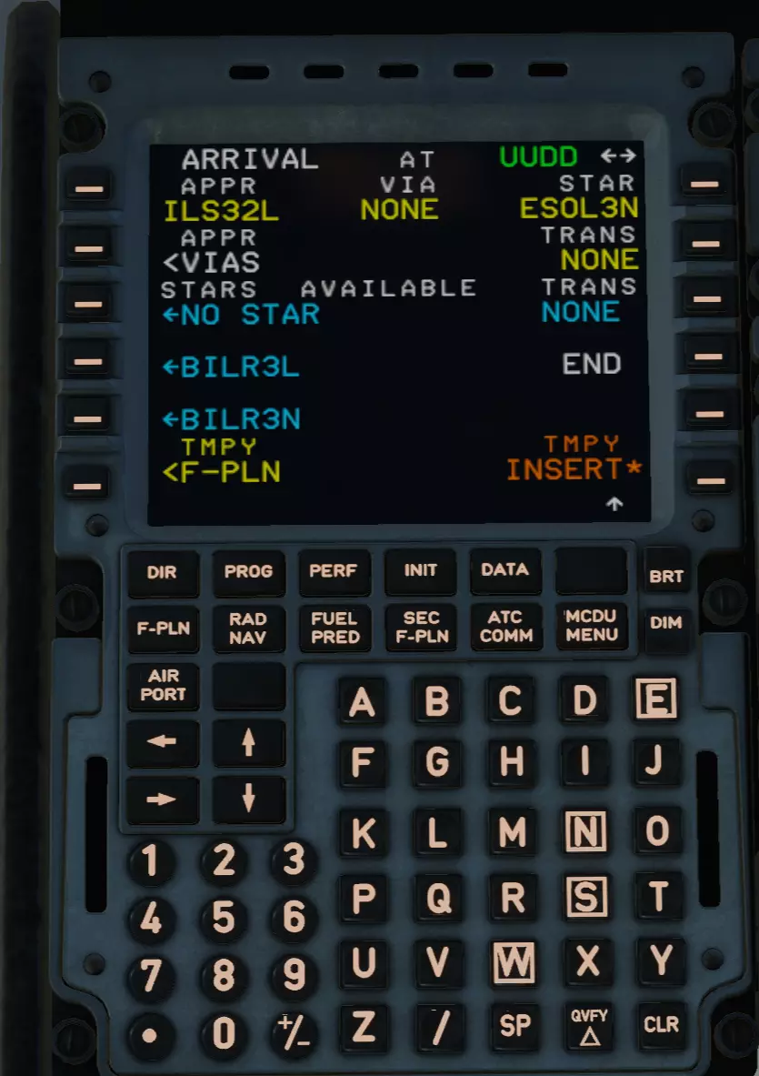 按下IMPY INSERT*键,进入F-PLN页面。向下滚动,找到我们的目的地机场UUDD。找到了吗?和往常一样,点击它。