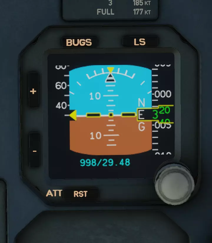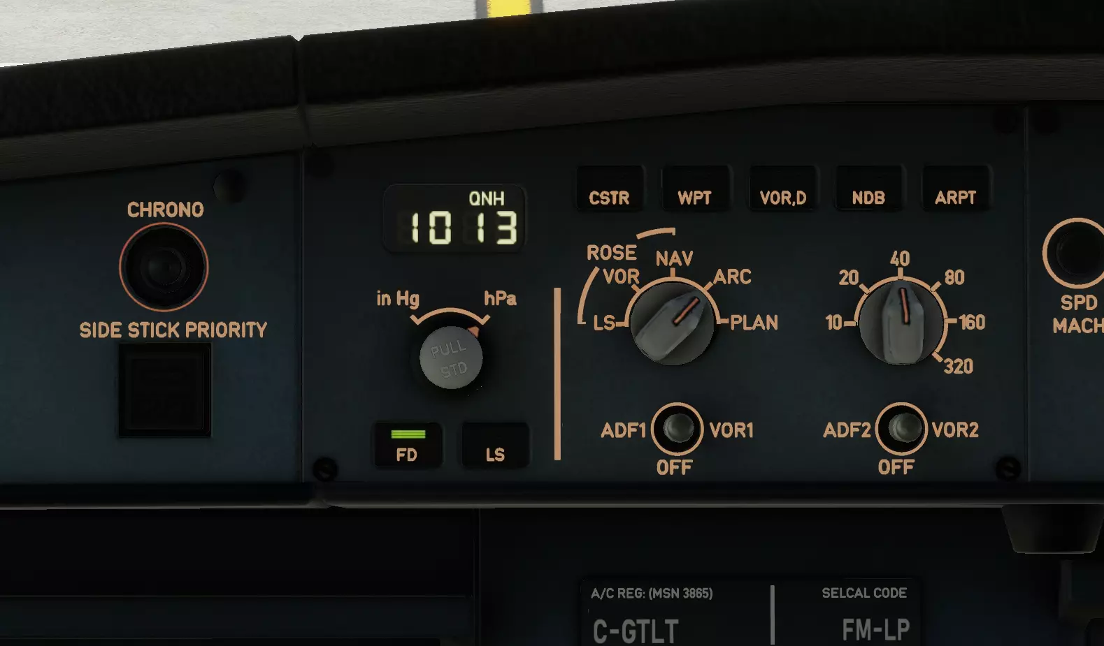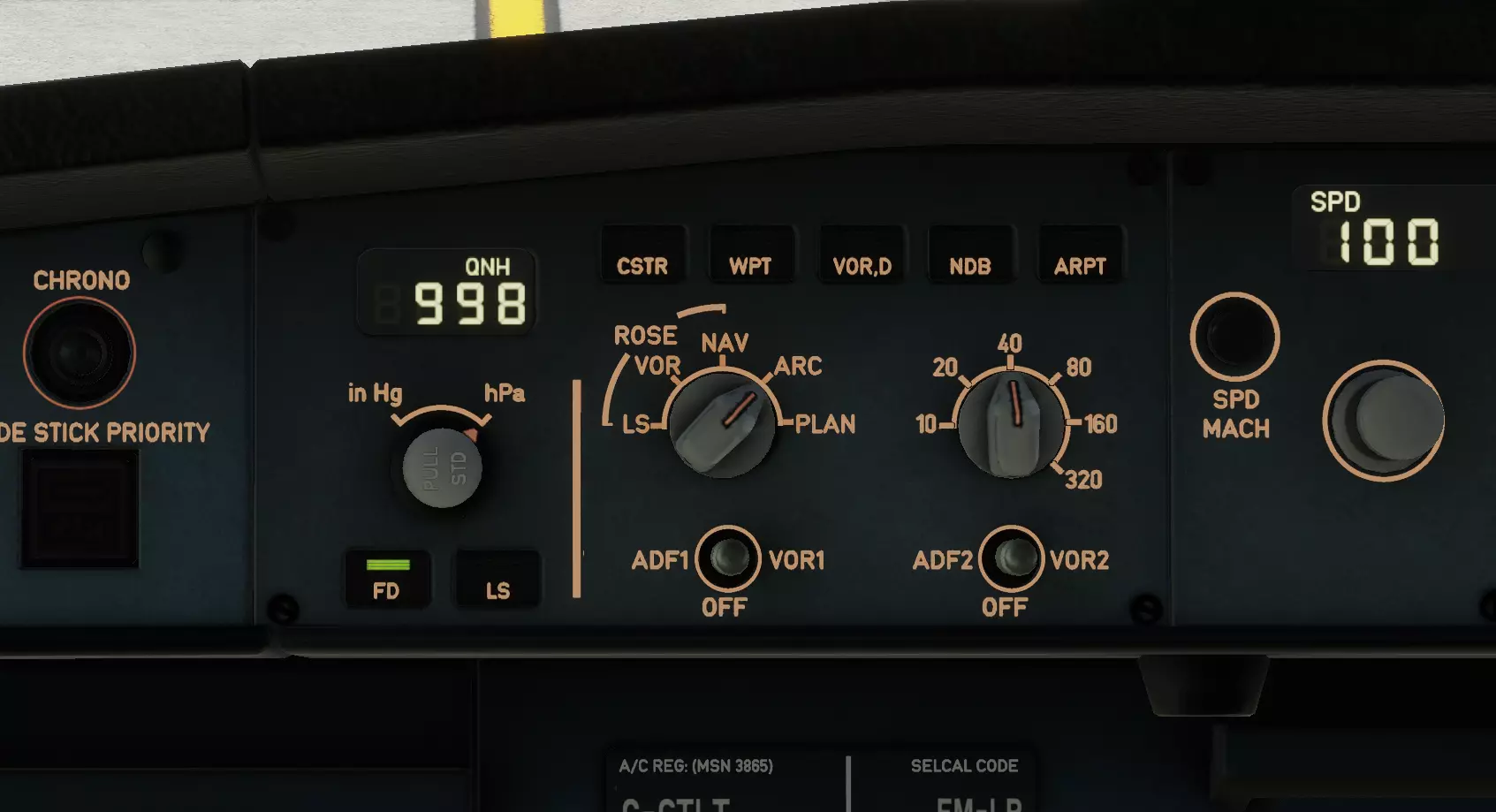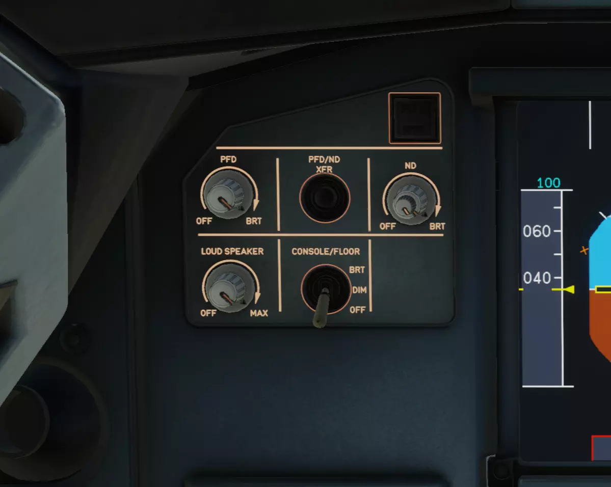 顺便说一下,PFD(主飞行显示器)和ND(导航显示器)的亮度是通过PFD旁边的这个面板来调节的。