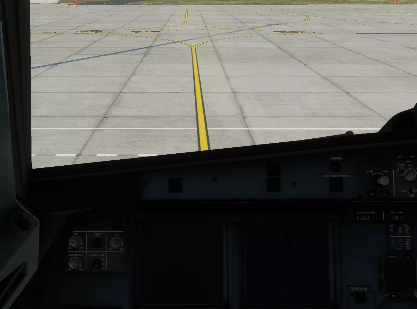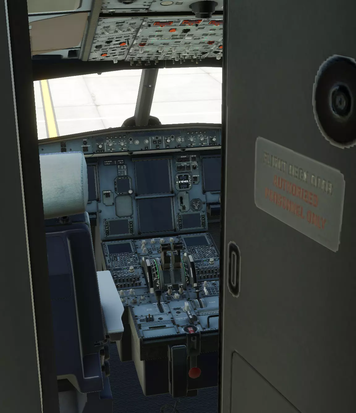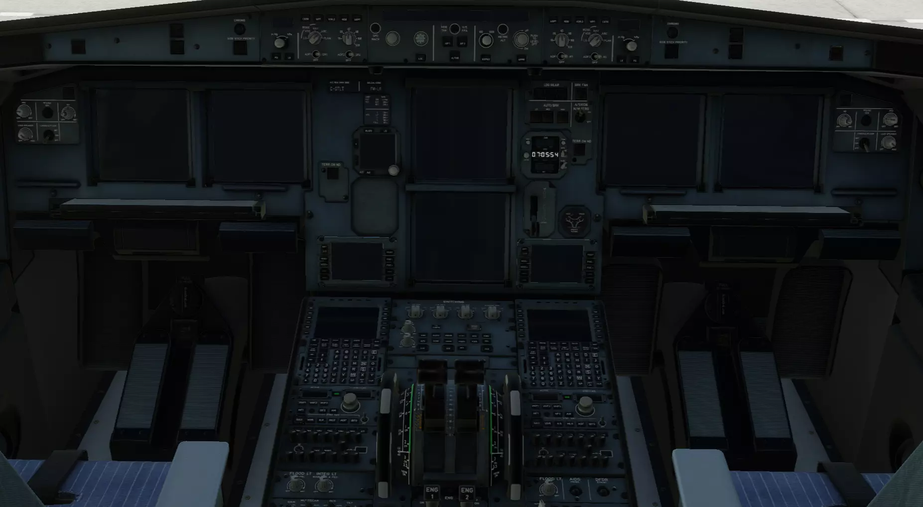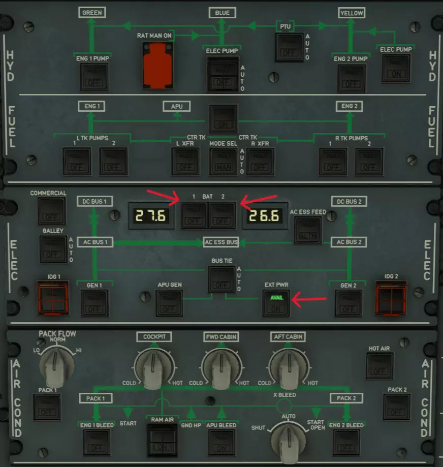 可能你的飞机上已经有东西在发热、发出声响或闪烁。这意味着飞机已从地面(地面电源)或APU(辅助动力装置)获得供电(有电力)。我将介绍飞机的CnD状态(冷舱状态)。如果你已经为飞机供电,请继续下一步。 飞机系统准备 你在机长座位上吗?很好!你可以为自己感到骄傲,毕竟你被托付了价值1.106亿美元的大家伙!为了不在第一天工作时搞砸,建议你先开始为飞机起飞做准备。害怕吗?紧张吗?别担心,飞机上的所有按钮都有标签,我会告诉你按按钮的顺序。首先,我们需要给飞机供电。我们有地面电源。在头顶面板上找到侧面标有ELEC的面板,这里有一个EXT PWR按钮,它是否显示绿色的AVAIL字样?如果是,就大胆按下它,你会看到我们的飞行仪表启动!之后找到标有BAT 1和BAT 2的两个按钮,这些是飞机的电池,也需要打开。