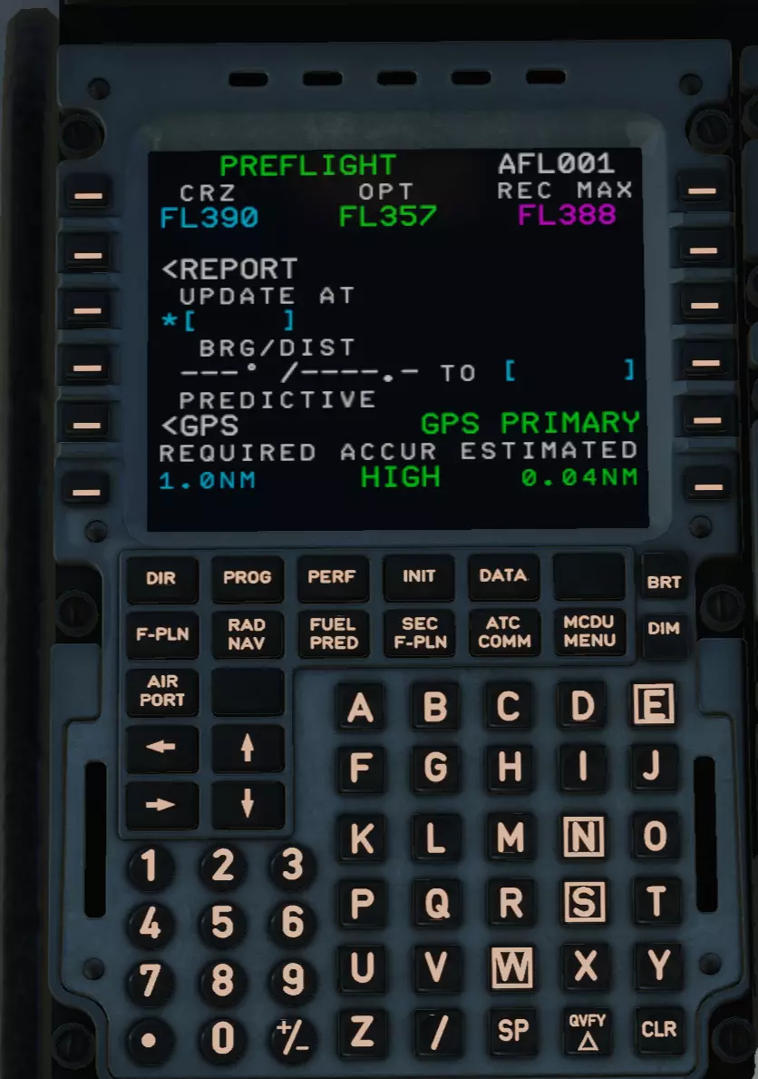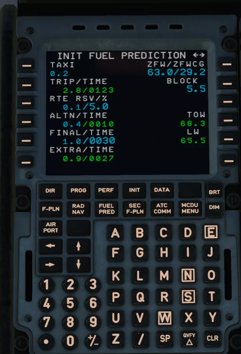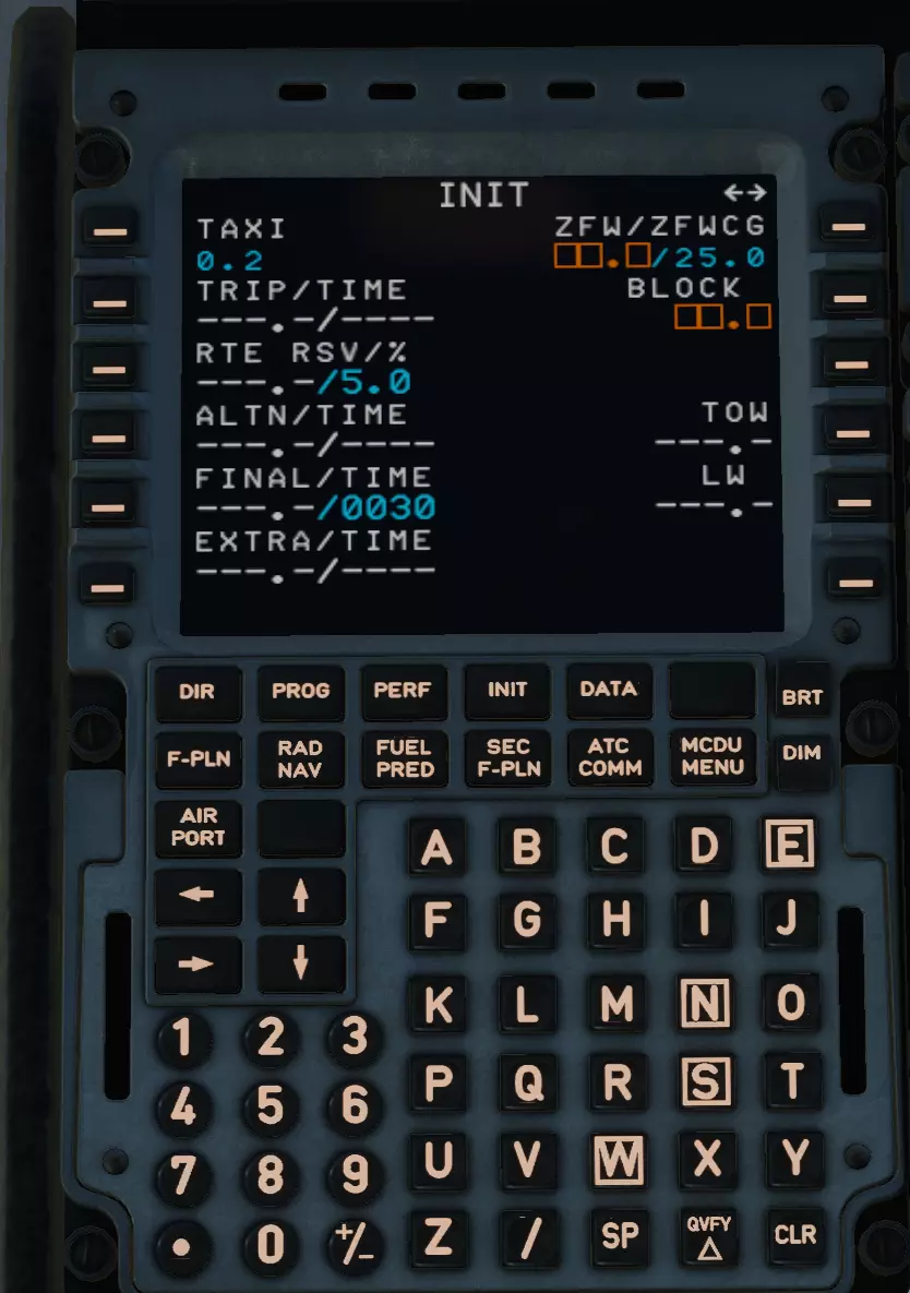 听到脚步声、孩子的哭声、说话声了吗?快把驾驶舱门关上!不然会漏风的。 接下来我们要处理飞行管理计算机的一项非常有趣的工作,不过这个稍后再说。 MCDU操作 听着,学员!你身后有188条生命,他们都非常渴望到达目的地! 是时候开始最有趣的部分了。 中央控制台上有一个叫做MCDU的设备。这对飞机来说是最重要的,因为没有发动机飞机还能飞行,但没有机载计算机就不行了。 我先简单介绍一下,之后可能会做更详细的说明。 我们开始填写吧。 把目光转向这件技术奇迹,你会看到第一页。