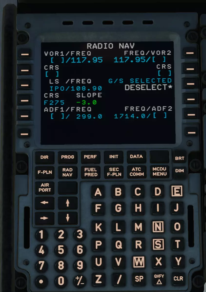 按下IMPY INSERT*键,进入F-PLN页面。 太棒了!恭喜你,最困难的部分已经过去了! 现在我们的飞机知道要飞往哪里了。 接下来选择RAD NAV。