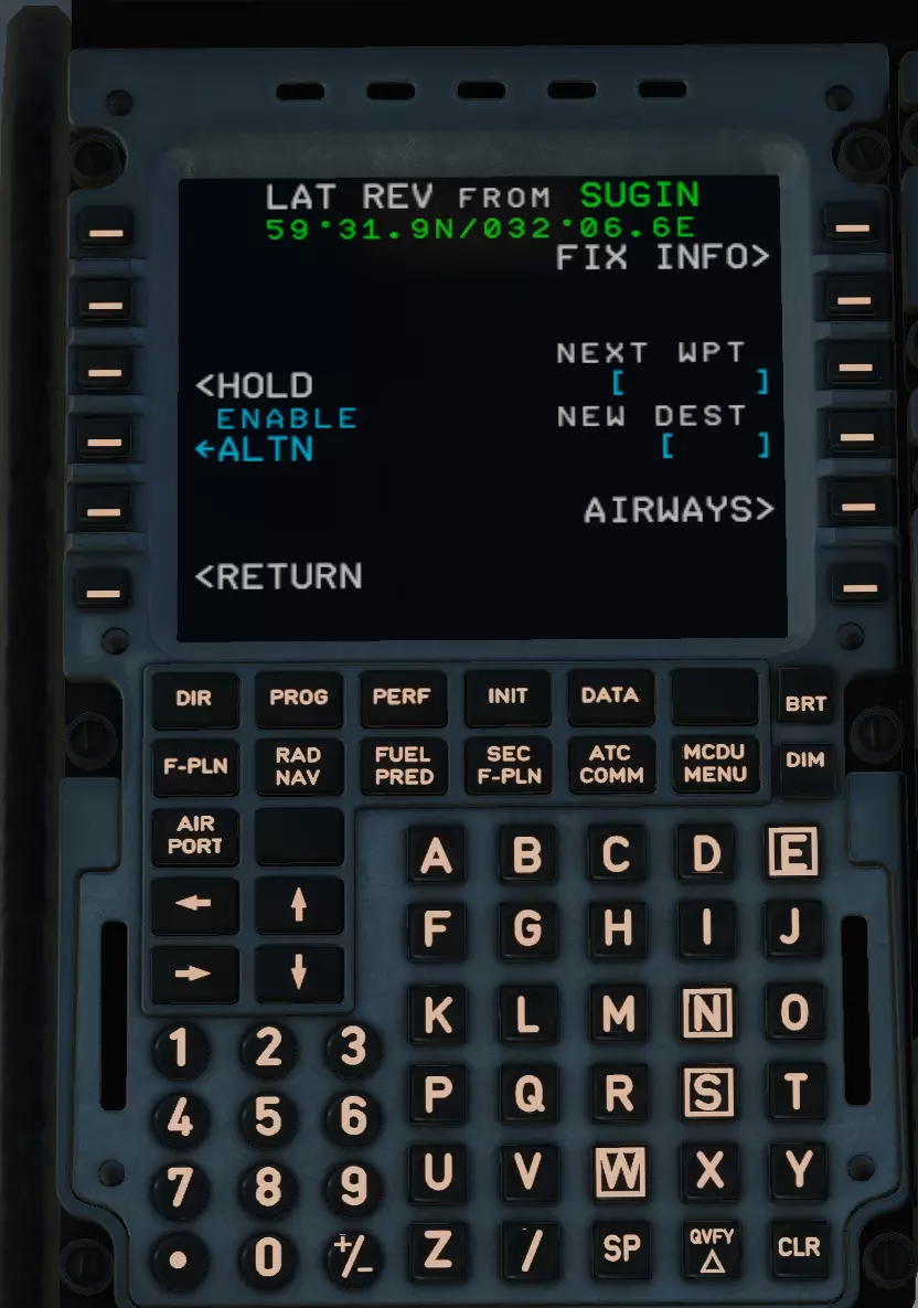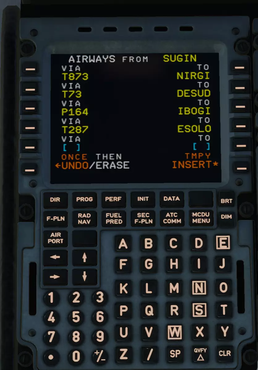 按下TMPY INSERT*键,再次进入F-PLN页面。向下滚动并选择我们飞行计划的终点,即SUGIN点。点击该点。