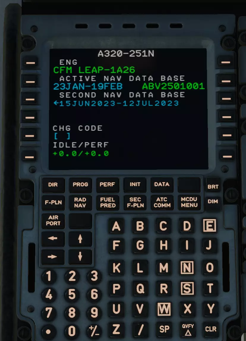 这里需要检查我们的导航数据库是否为最新版本,以及飞机模块中是否正确设置为飞机类型,而非其他车型(例如我使用的是A320 neo,页面顶部显示为A320-251N,这是正确的)。 同时检查发动机信息(我使用的是CFM LEAP 1A26,模块中记录正确)。 MCDU【多功能控制显示组件】的填写有特定逻辑,可总结为DIFRIPPS。如果你,我的年轻朋友有很好的推理能力,那么你已经明白这是Database、INIT、F-PLN、RAD-NAV、INIT B、PERF、PROG、SEC F-PLN的缩写。希望你都明白了。我们继续!按照这个逻辑,打开INIT页面。