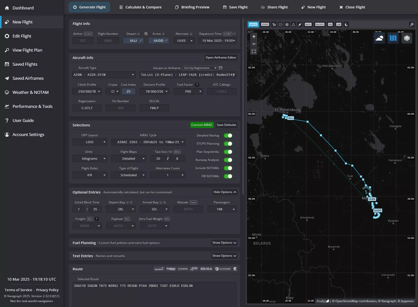 她告诉我们,我们的导航系统需要7分钟以上才能完成设置。本想在这段时间里合理利用一下,但这时空乘人员走了过来,你的“导航”已经准备好在这7分钟内和她一起去洗手间。 不过现在你又回到了副驾驶座,必须再次投入工作。现在我们来规划航线。今天我们要飞往多莫杰多沃(ICAO代码UUDD),而雅虎导航提供的路线并不适合我们。飞机沿着点和航线飞行(在设置了化油器的“ семерке”上你也是沿着航线飞行)。前往“ симбриф”并在那里进行各种操作,就能获得航线!航线看起来就是这样。