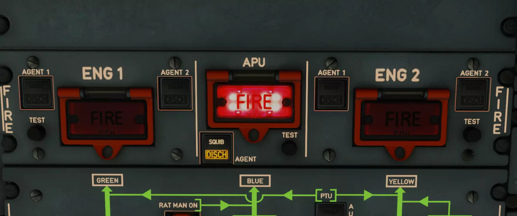 这里有三个红色的大按钮,虽然按下它们并不会让你把美国化为核火焰的灰烬,但也不会有什么好结果,所以不要碰它们。你需要找到APU区域,那里有一个TEST按钮,按下并按住它。