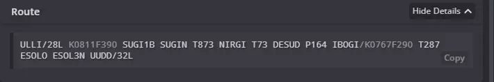 逻辑如下:飞行计划-计划终点-航线-导航点-航线-进近计划导航点-进近计划。 示例:导航点(IBOGI),航线(T287),导航点(ESOLO),计划(ESOL3N)。 将这些信息输入我们的电脑。记住,航线在左,导航点在右。 这就是正确填写的航线示例。