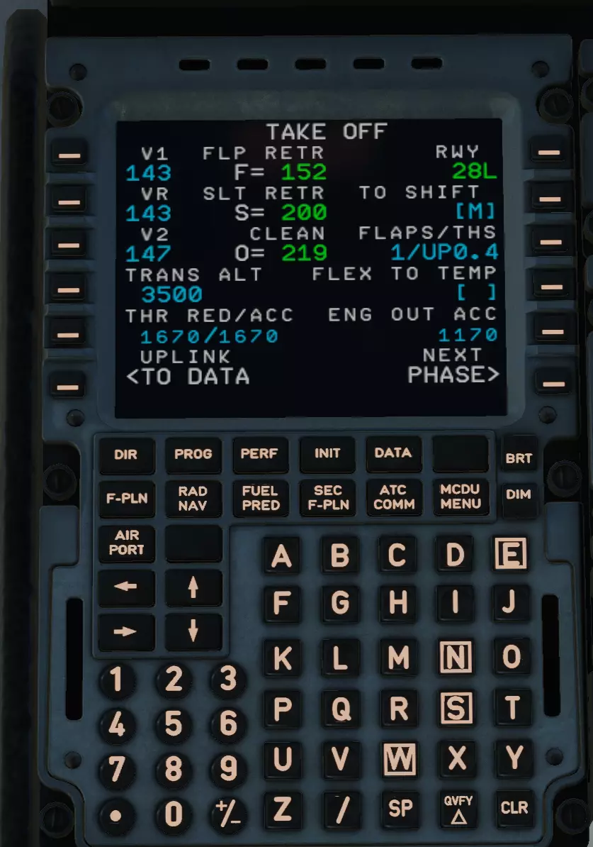V1、V2、VR速度,襟翼/水平安定面(THS)均取自同一插件。我们将使用发动机最大推力起飞,因此FLEX TO TEMP窗口留空。正确填写的页面如下所示