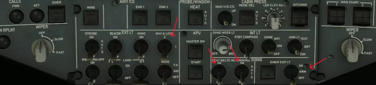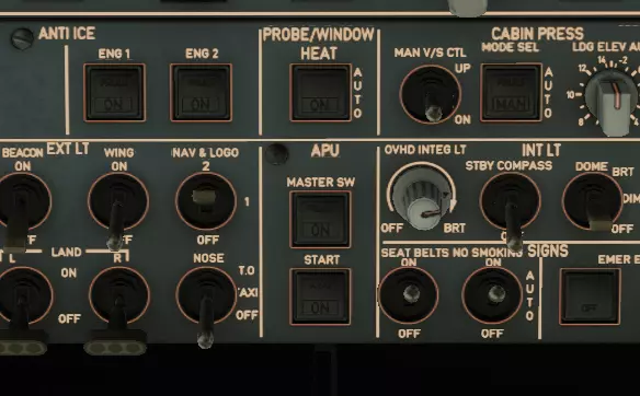 太好了!我们有电了! 接下来我们需要在驾驶舱内表明自己的存在。为此,在头顶面板的最下方找到标有【EXT LT】的面板,找到【NAV&LOGO】开关并将其拨至2档。这样你的飞机尾翼上的标志灯和机翼上的灯光就会亮起。你已经向周围所有人表明你在驾驶舱内,并准备起飞。接下来找到【SIGNS】面板以及【SEAT BELTS】和【NO SMOKING】两个开关,将它们拨至【ON】档。现在我们的乘客将系好安全带,嘴里不再叼着电子烟。现在找到EMER EXIT LT开关并将其拨至ARM位置,这样当主灯出现故障时,你就能开启客舱应急照明的自动开启功能。