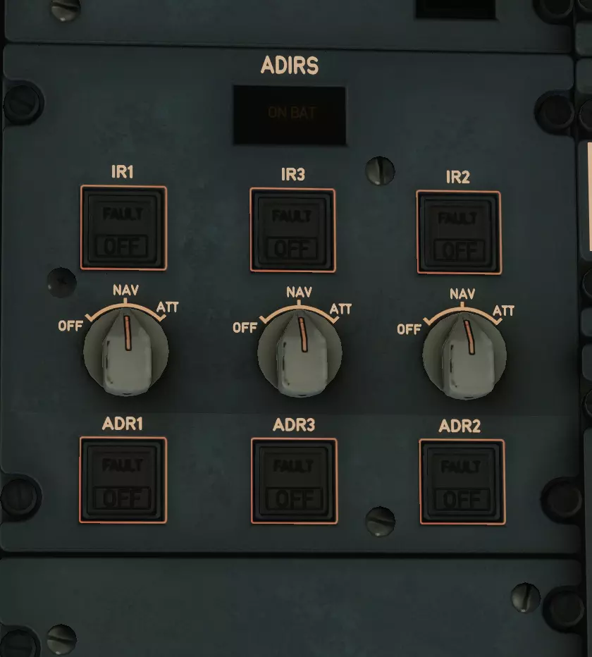 好的,我们走在正确的道路上!我们已经完成了所有地面安全规范。未来永远记住:安全第一——这是整个航空业的座右铭。 那么,学员,你准备好飞向星空了吗?凭感觉?不行!那我们就开始准备机载导航系统。首先,我们需要开启并校准(简单说就是调整,就像你调整自己“小七”上的化油器那样)我们的导航系统。在头顶面板的最上方,找到标有ADIRS的面板。看到这3个旋钮了吗?