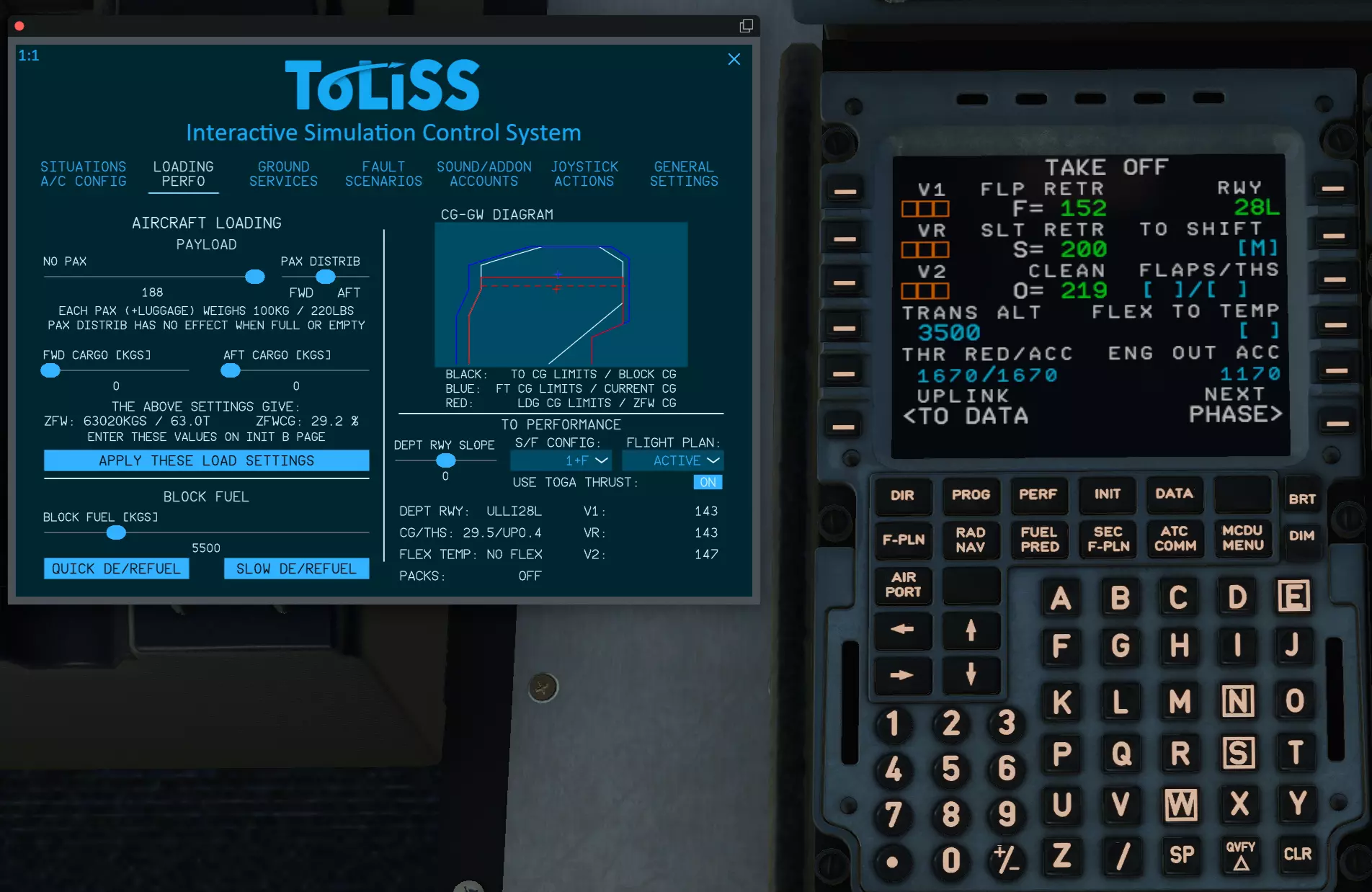 一切都已自动计算完成,我们不需要再做其他操作了。 现在选择【PERF】 出现了【TAKE OFF】窗口,这是我们的起飞参数。