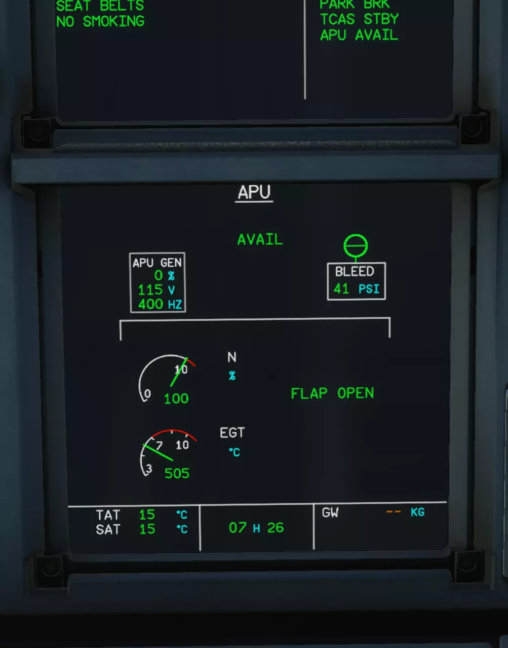 ON BAT指示灯亮了?没关系,很快就会熄灭。如果没熄灭——那我们就有麻烦了。 现在看看上方的电子中央飞机监控系统,那里出现了有趣的提示。