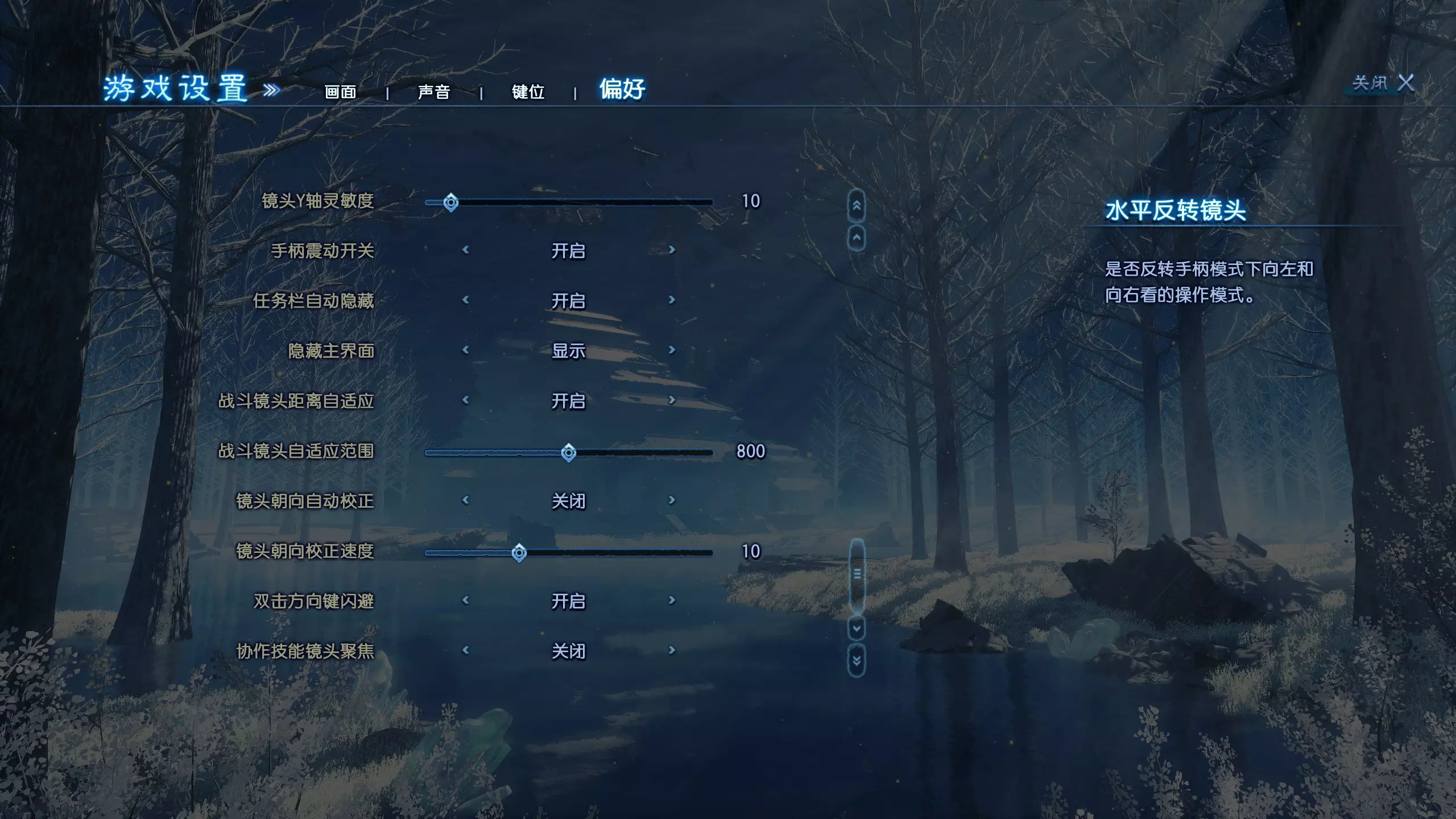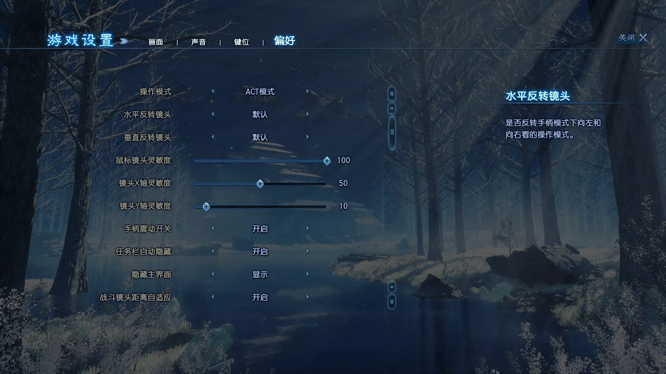 控制模式:经典角色扮演模式/动作模式/手柄 水平反转:默认/反转 垂直反转:反转/默认 鼠标灵敏度 X轴灵敏度 Y轴灵敏度 手柄振动:关闭/开启 任务日志自动隐藏:关闭/开启 隐藏界面:开启/关闭 战斗中自动调整相机距离:关闭/开启
