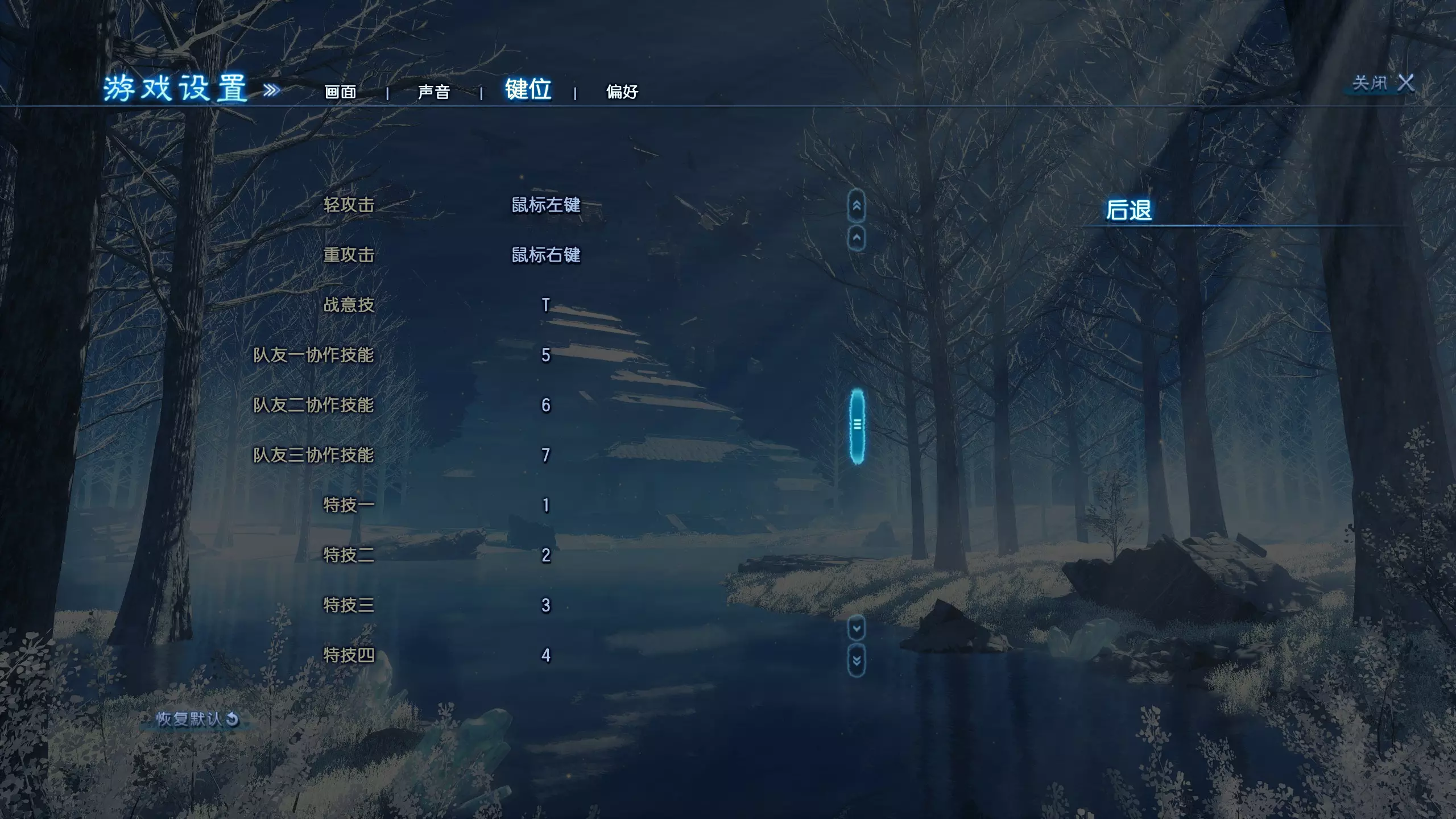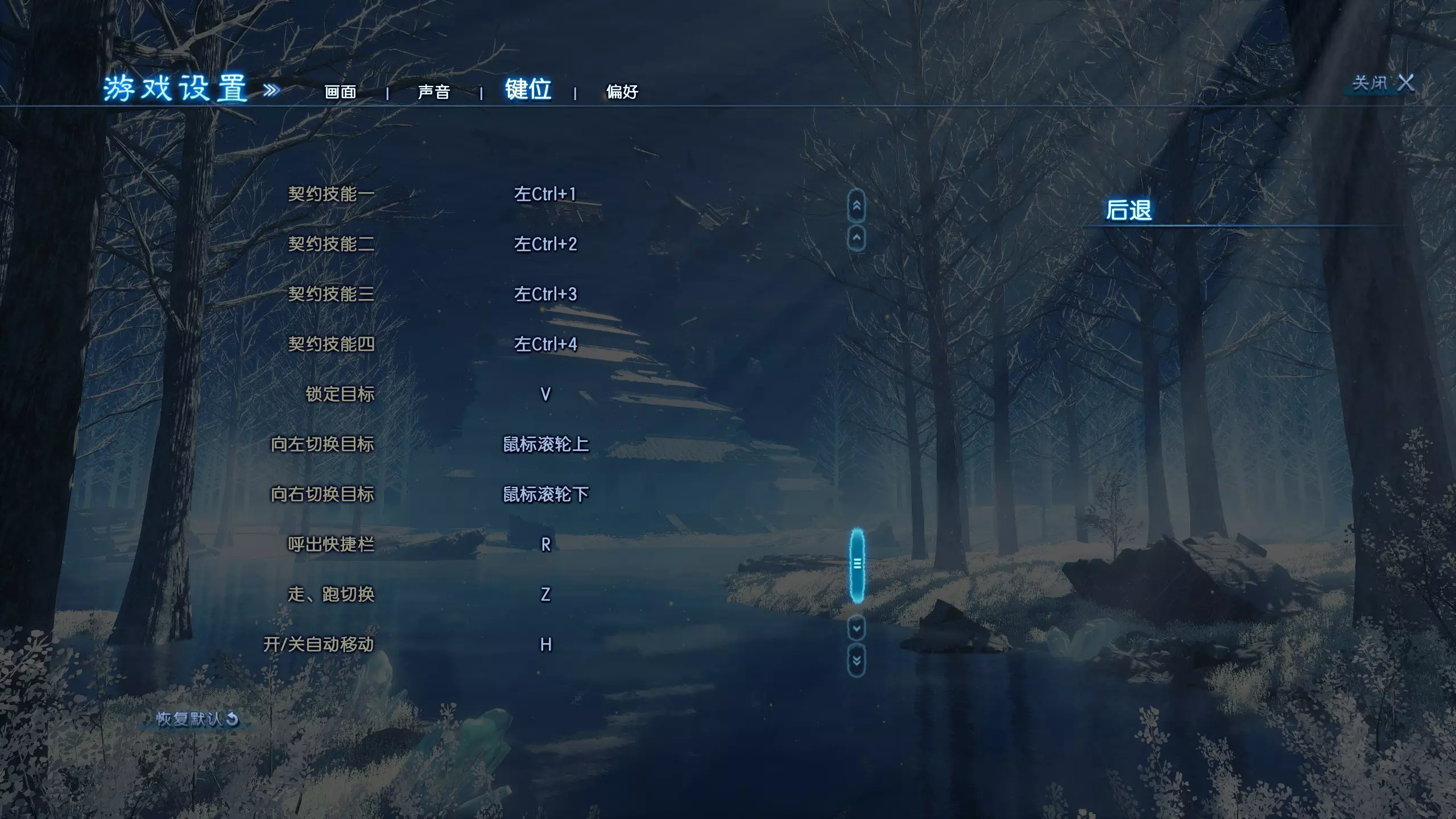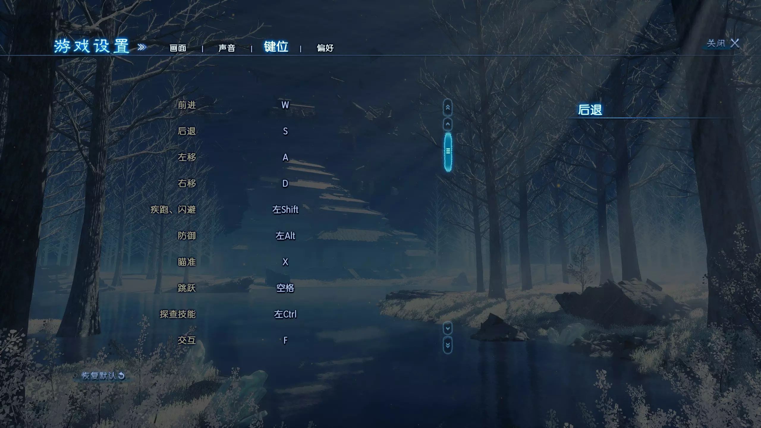 从上到下,选项如下: 后台静音:关/开 主音量 背景音乐 环境音 界面音效 语音 其他 游戏设置 - 按键绑定 从上到下,选项如下: 我相信大家都知道WASD,但还是说明一下吧:p