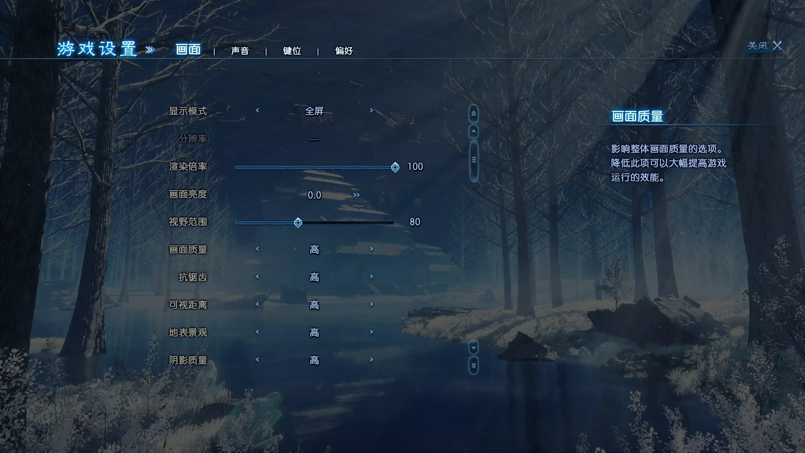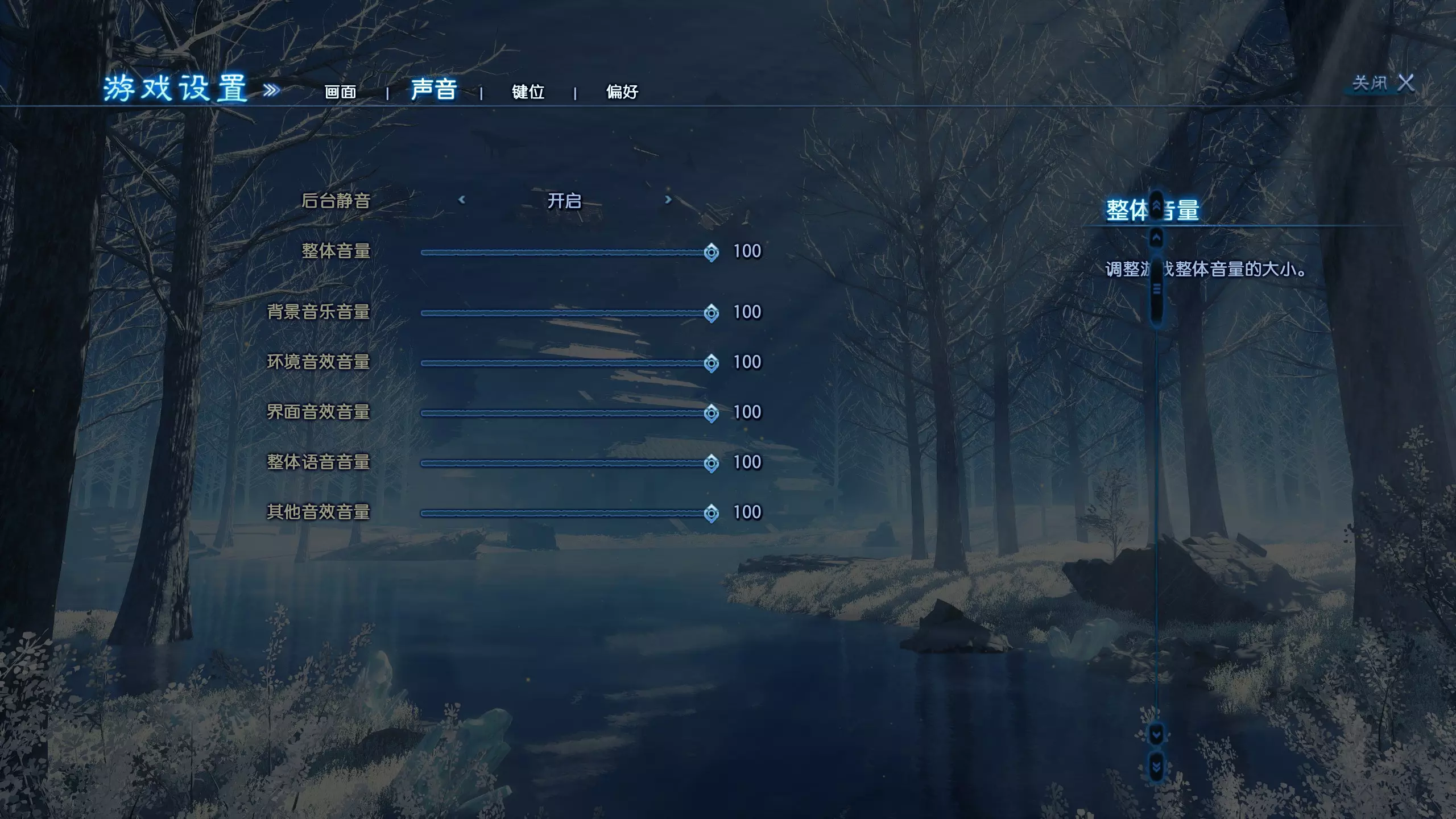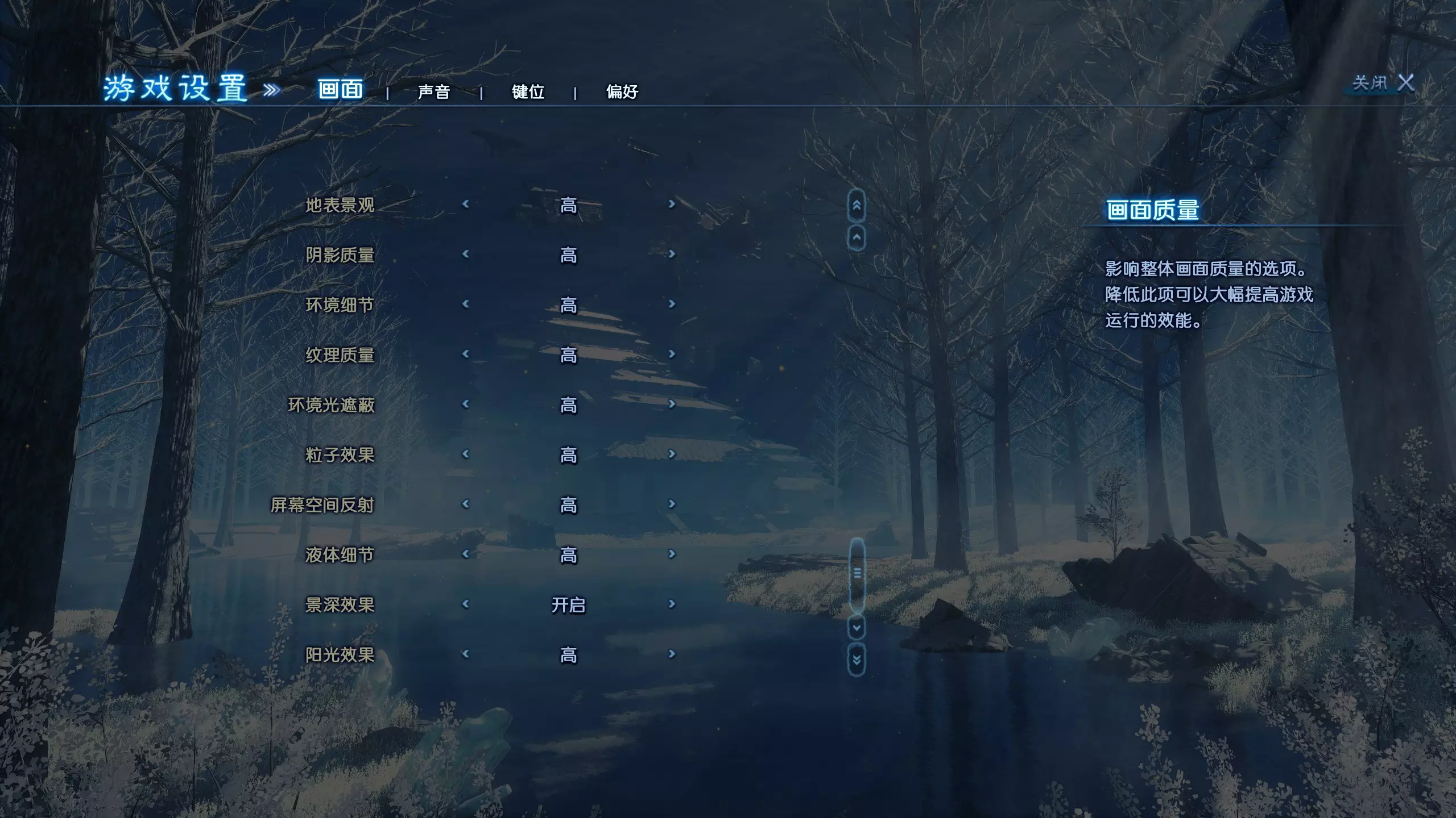 环境细节:低/中/高 纹理质量:低/中/高 屏幕空间环境光遮蔽(SSAO):低/中/高 粒子效果:低/中/高 屏幕空间反射(SSR):低/中/高 液体细节:低/中/高 景深:关闭/开启 光照质量:低/中/高 游戏设置 - 声音