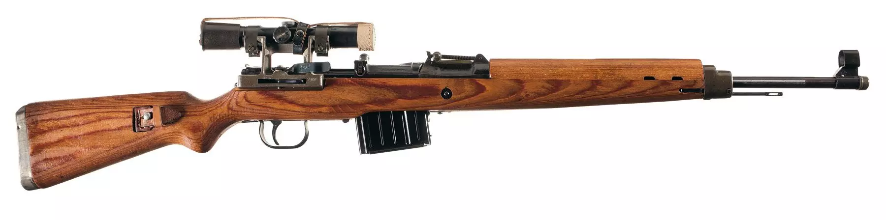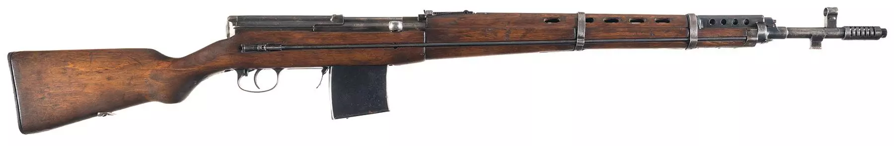 SVT-38(托卡列夫1938型)(苏联) 一种由费多尔·托卡列夫设计的半自动步枪,研发于20世纪30年代中期,使用7.62×54R毫米弹药和10发可拆卸盒式弹匣。该武器结构复杂,在战斗中表现出脆弱性,但仍取得了一些成功。1940年,它被改进型SVT-40所取代,其总产量达数十万支,其中包括约50,000支带瞄准镜的狙击型号。曾被该步枪击中的德军对其印象深刻,他们研究了缴获的SVT-38和SVT-40,并最终在1941年生产出GEW 41,1943年生产出GEW 43。