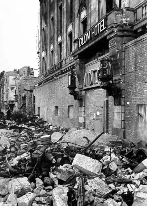 在1945年柏林阿德隆酒店的废墟下部,照片中可以辨认出三枚【Fliegerfausts】。 地雷与手榴弹