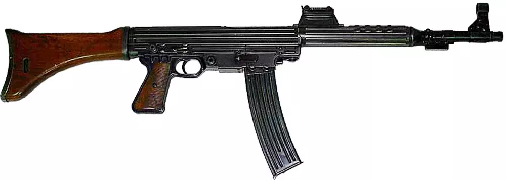 MKB 42(Maschinenkarabiner 42(H))(德国) 这是二战期间由雨果·施迈瑟在C.G. Haenel Waffen und Fahrradfabrik公司于1940-1941年设计的一款早期德国突击步枪。其中(H)代表Haenel,此外还有瓦尔特公司生产的MKB 42(W),但(H)型号更为成功。MKB 42(H)采用开膛待击方式,配备可拆卸的30发盒式弹匣。它是一款可选择射击模式的步枪,射速为600发/分钟。陆军要求Haenel公司进行改进,包括借鉴瓦尔特版本的一些设计,改进后的步枪被命名为MP 43,该枪后来成为了Sturmgewehr 44(简称StG 44)突击步枪的前身。德国人是最早研究当时战斗步枪弹药的国家之一,其中包括他们的7.92毫米×57毫米弹药,并判定它们的威力和射程超出了普通士兵的需求。由于大多数战斗发生在400米以内的距离,如果能使用威力较小的弹药,士兵就能携带更多这种更小的弹药。为此,这款步枪设计了新型7.92毫米×33毫米库尔兹(短)弹药。 游戏在这一点上是准确的,该武器有时会被德国精锐部队携带。