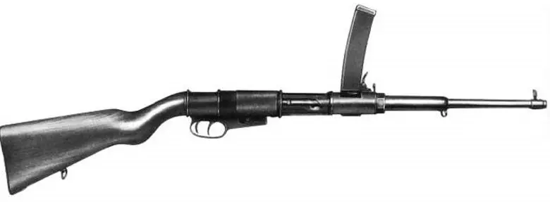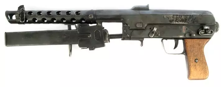 FNAB-43(意大利) 该枪于1942年设计,由布雷西亚国家兵工厂(Fabbrica Nazionale d’Armi di Brescia)在1943年至1945年间生产了约7000支。FNAB-43是一款可选择射击模式的9毫米帕拉贝鲁姆口径冲锋枪,配备折叠枪托,使用10发、20发或40发可拆卸盒式弹匣供弹,并采用杠杆延迟反冲系统,从闭膛位置击发。它的射速相对较慢,为400发/分钟,弹匣可向前折叠至枪管下方以实现紧凑性,但折叠状态下无法射击。由于需要大量精密加工,其制造成本较高。