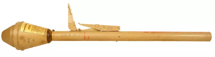 铁拳60(“坦克拳”或“装甲拳”)(德国) 这种廉价的单发无后坐力德国反坦克武器由一个小型一次性预装发射管组成,发射高爆聚能装药反坦克弹头,可由单兵操作。铁拳60是最常见的型号,于1944年初开始使用。尽管其射程很短,使射手处于极度危险之中,但它是一种非常有效的武器,几乎可以摧毁战场上的任何坦克。铁拳应夹在腋下(见下图),射手使用折叠式瞄准具作为 rear sight,弹头顶部作为 front sight。发射后发射管即被丢弃。后期型号的发射管本可使用多达十次,但这些产品在战争接近尾声时才问世,因此未能得到广泛应用。包括美国陆军第82空降师在内的盟军部队缴获了许多这类武器,发现它们比自己的巴祖卡火箭筒更有效,便在突出部战役中投入使用。